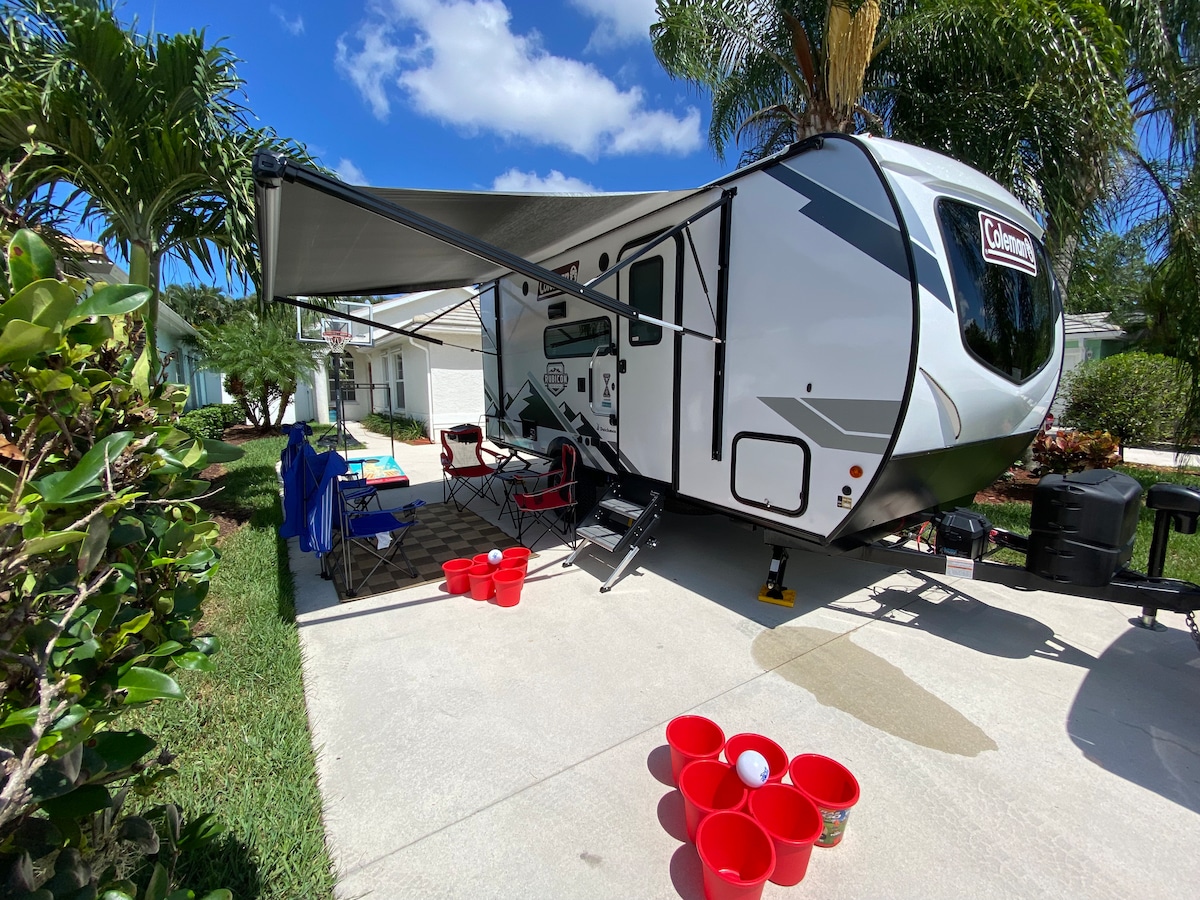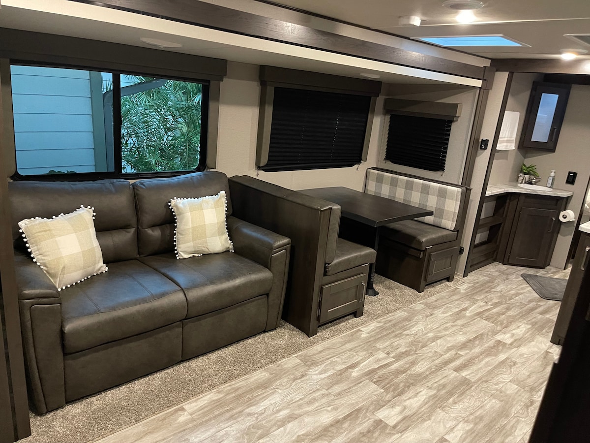 ¡Nos encanta nuestra autocaravana y nos encantaría compartirla contigo! Hay un lindo tema de piña, que rinde homenaje a la historia agrícola de la cercana Jensen Beach. Características: colchón de espuma viscoelástica, sábanas de microfibra, TV de 27 pulgadas, estéreo bluetooth, nevera, congelador, cocina (solo), cafetera, freidora de aire, comedor espacioso y acceso a playas, áreas naturales, autopista y I95. La autocaravana está estacionada en nuestra entrada; tendrás acceso a lo largo del lado de la casa a nuestro patio trasero, ¡incluyendo un pozo de fuego, asientos al aire libre y una parrilla!