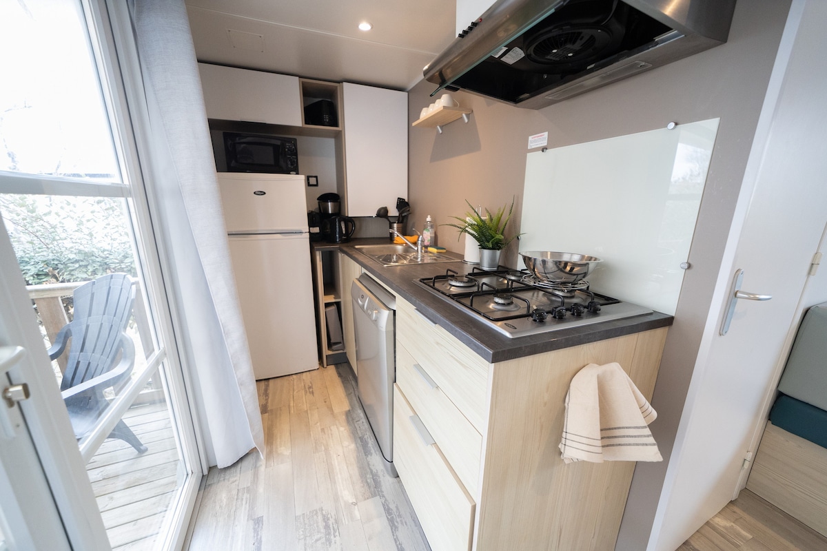🏡 CASA MÓVIL de 40 m2 CON AIRE ACONDICIONADO - 6/8 personas cerca de la ZONA DE DIVERSIÓN - Vista estanque - Terraza de 20 m2 totalmente cubierta - Muebles de jardín - Tumbonas - Plancha - Parcela privada de 100 m2🏡 ⛱ Complejo acuático climatizado bordeado de palmeras, piscina, jacuzzi, gran piscina infantil, 2 toboganes 🛝Campos de petanca, tenis, baloncesto, pickleball, mini golf, tirolina, sala de juegos (billar, juegos de arcadas...), zona de musculación al aire libre, zona de bienestar, zonas de juegos para niños, toboganes ...