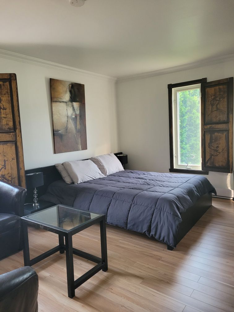 Designer Chic - Cottaging at it's finest. Maison Napoleon, the newest BnB in town! Sit back and unwind in this charming all season chalet. Cozy queen bed with rustic elegance. Bespoke custom headboard, the owner's own craftsmanship. Custom blackout drapery for full black out of the windows. Beautiful post and beam construction visible everywhere. Hand woven Persian wool rugs and private bathroom comes with this room. High speed Wifi, parking and breakfast are included in the rental