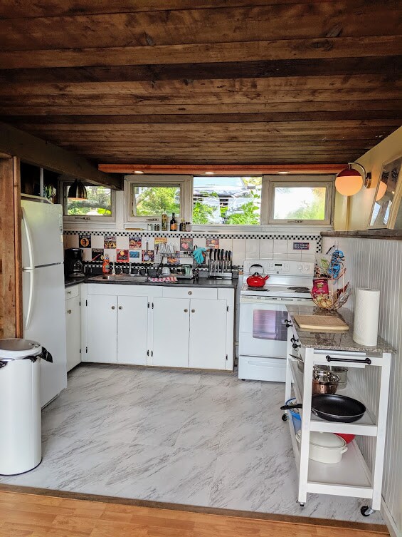 Cocina abierta + salón + comedor, con un techo inclinado de madera y dos correderas con vistas a la terraza, patio trasero + pantano. Cocina funcional con fregadero de granja, lavavajillas, cocina y despensa. Dos cómodas habitaciones con aire acondicionado de ventana, colchones nuevos y cortinas opacas. Baño con bañera/ducha + muchas toallas para la playa o el uso de la casa. ¡La ducha al aire libre es genial en los meses más cálidos! Disfruta de este tranquilo y escondido lugar de Wellfleet con muchos senderos para caminar y hermosas vistas del atardecer justo al final de la carretera.