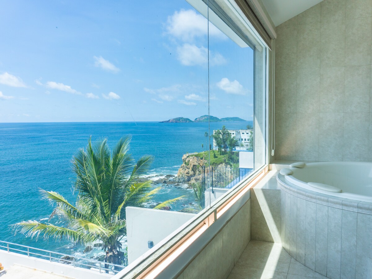Un favorito de los huéspedes por las mejores vistas de la ciudad, con una ubicación céntrica en primera línea de playa, entre los condominios más buscados de Mazatlán, con un historial de alquiler impecable de siete años. Suite en esquina en el piso 14, increíbles vistas panorámicas del océano, la playa y la ciudad. Camina hasta la playa de arena, el malecón y los restaurantes. Starbucks, tienda de conveniencia OXXO y Pizza Hut ubicados en la primera planta. Piscina, gimnasio, aparcamiento y seguridad 24/7... Una experiencia de condominio frente a la playa absolutamente impresionante.