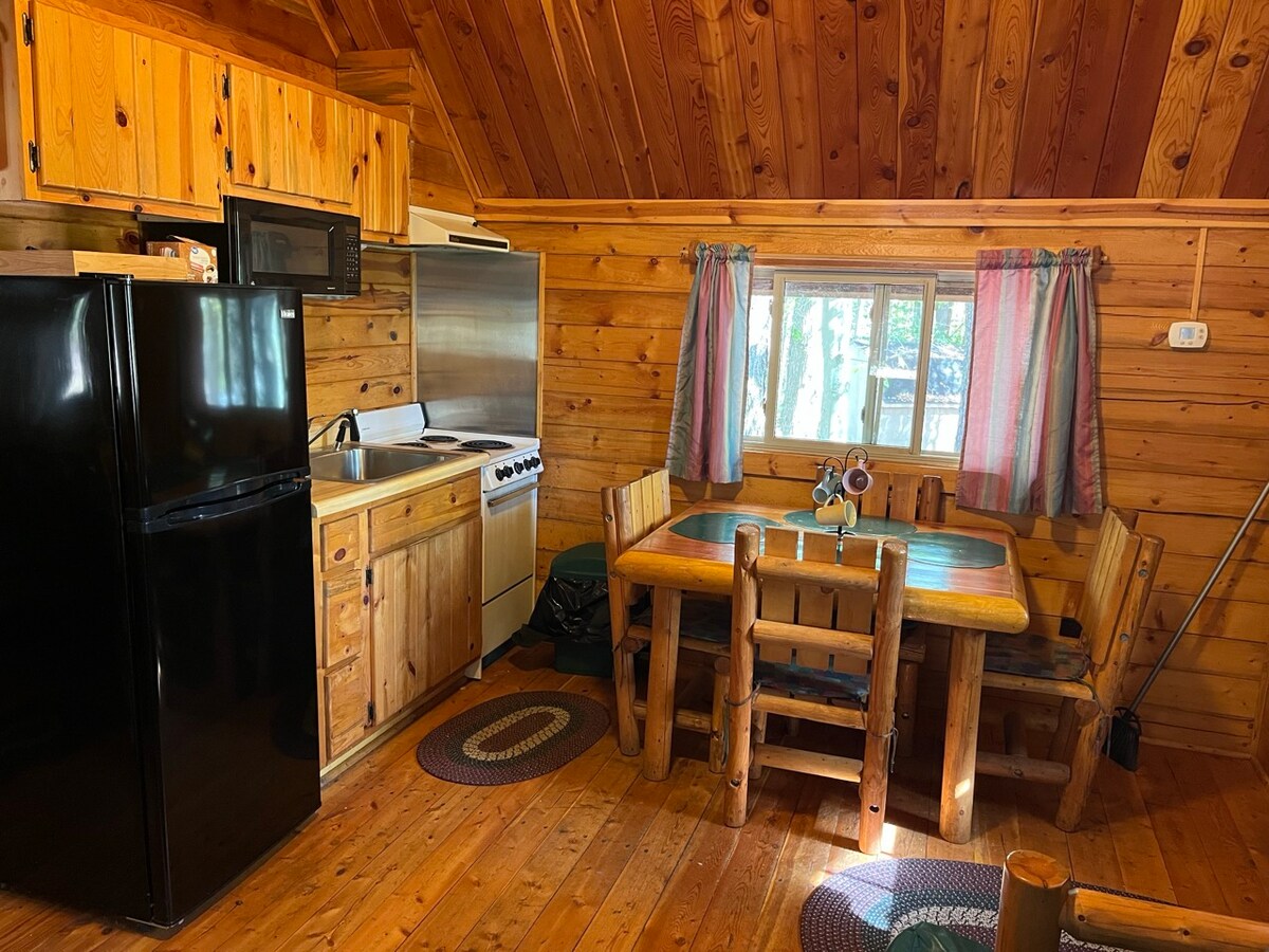 Welcome to Cozy Embers Campground & Cabins! Settle in and relax in our Deluxe Cabin, perfect for a peaceful getaway. This charming one-bedroom cabin features a full bed, an ensuite bathroom with shower, and a comfortable living room with a full-size futon and gas fireplace. Enjoy a mini kitchen with full-size fridge, stove/oven, microwave, coffee maker, and dining table for four. Bed and bath linens are included. Outside, unwind by the firepit or sway on the porch swing and soak in the quiet.