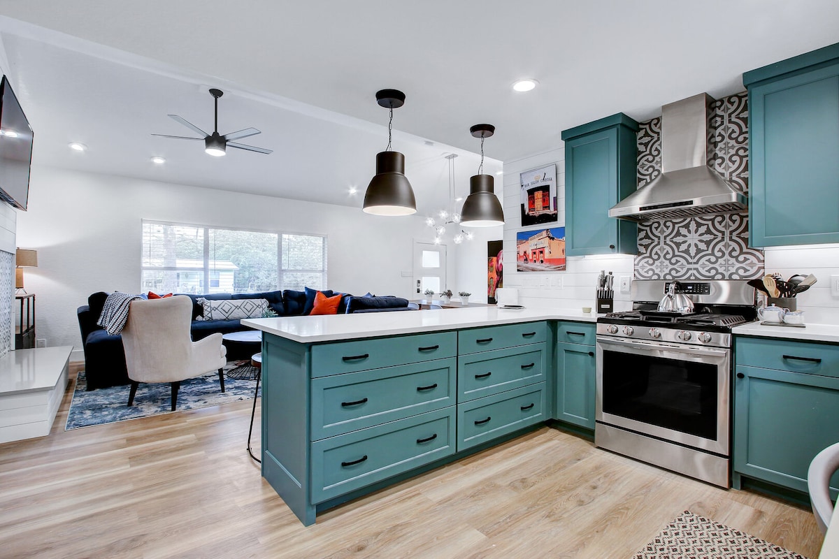 Este es el Airbnb más lujoso, único, contemporáneo y relajante de todo San Antonio. La reciente RENOVACIÓN COMPLETA DE LA CASA supera el nivel de calidad que uno esperaría en un centro vacacional de alta gama, ya que cuenta con baños completamente nuevos llenos de mármol, chorros corporales, duchas de efecto lluvia, iluminación controlada por la aplicación LED de Philips y nuevos tocadores y espejos LED contemporáneos. No escatimamos en gastos y amueblamos la casa con muebles de alta gama, haciendo que parezca una sala de exposición de Zgallerie.
