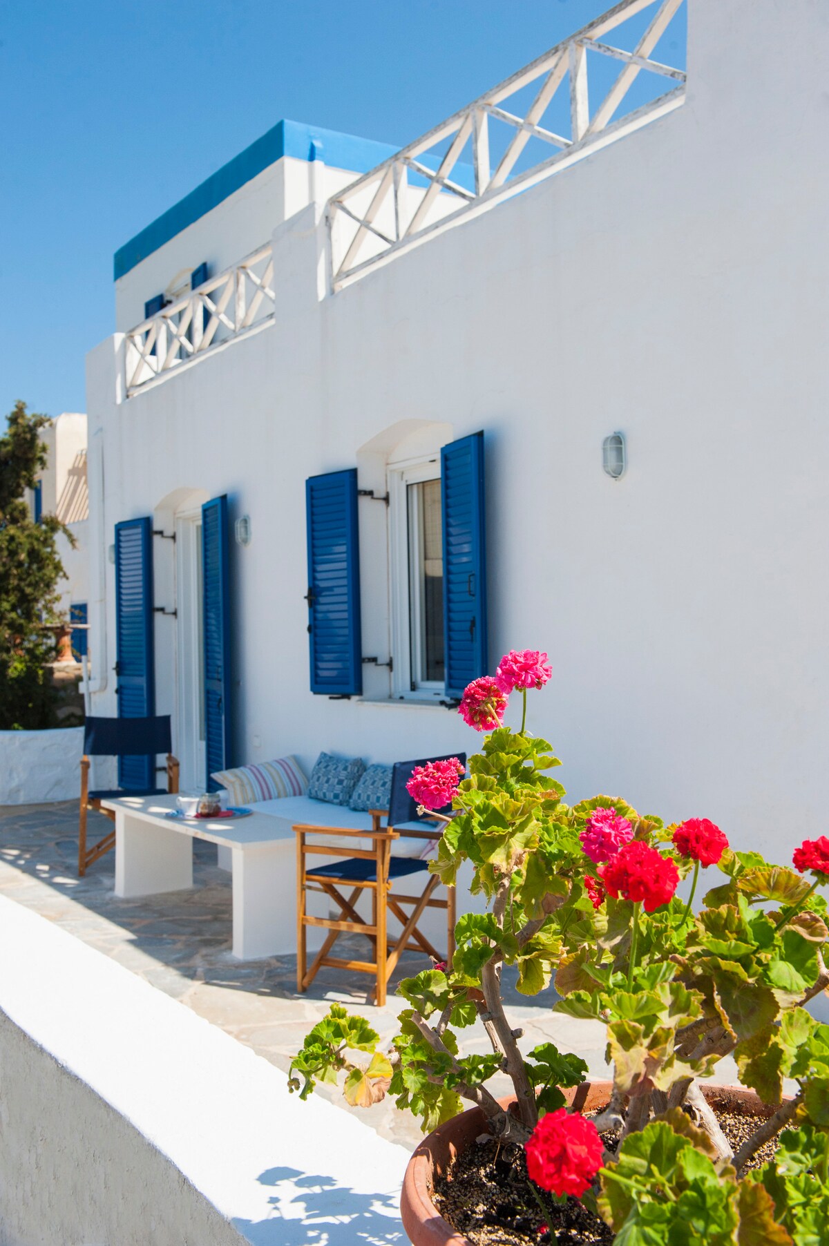 Un estudio independiente de piedra con su propio patio espacioso, bajo dos eucaliptos que proporcionan una generosa sombra durante todo el día, con vistas al pueblo de Chroussa y al mar. Decorado con estilo con muebles griegos antiguos, cuenta con un alojamiento tradicional e irradia una calidez hogareña. Relájate en la hamaca mientras bebemos nuestro vino casero o lee un libro bajo el chirrido de las cigarras, ¡esa es nuestra definición del verano griego! ¿Demasiado calor? Pídenos que llenemos la cisterna para revitalizar tu cuerpo.