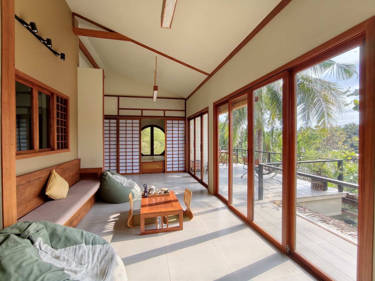 A spacious, cozy, connect-to-nature homestay. A space to relax or do anything that nourish your mind and body. The apartment is on the 2nd floor, furnished with a large living room, a bedroom, a zen room (could become a 2nd bedroom if you book from 3-4 guests), a kitchen, a spacious bathroom with an indoor bathtub and outdoor shower, a large river view balcony NOTE: - If book 1-2 guests: 1 bed - If book 3-4 guests: 2 beds - If book 1-2 guests but need 2 beds: extra price is 250.000vnd/ night