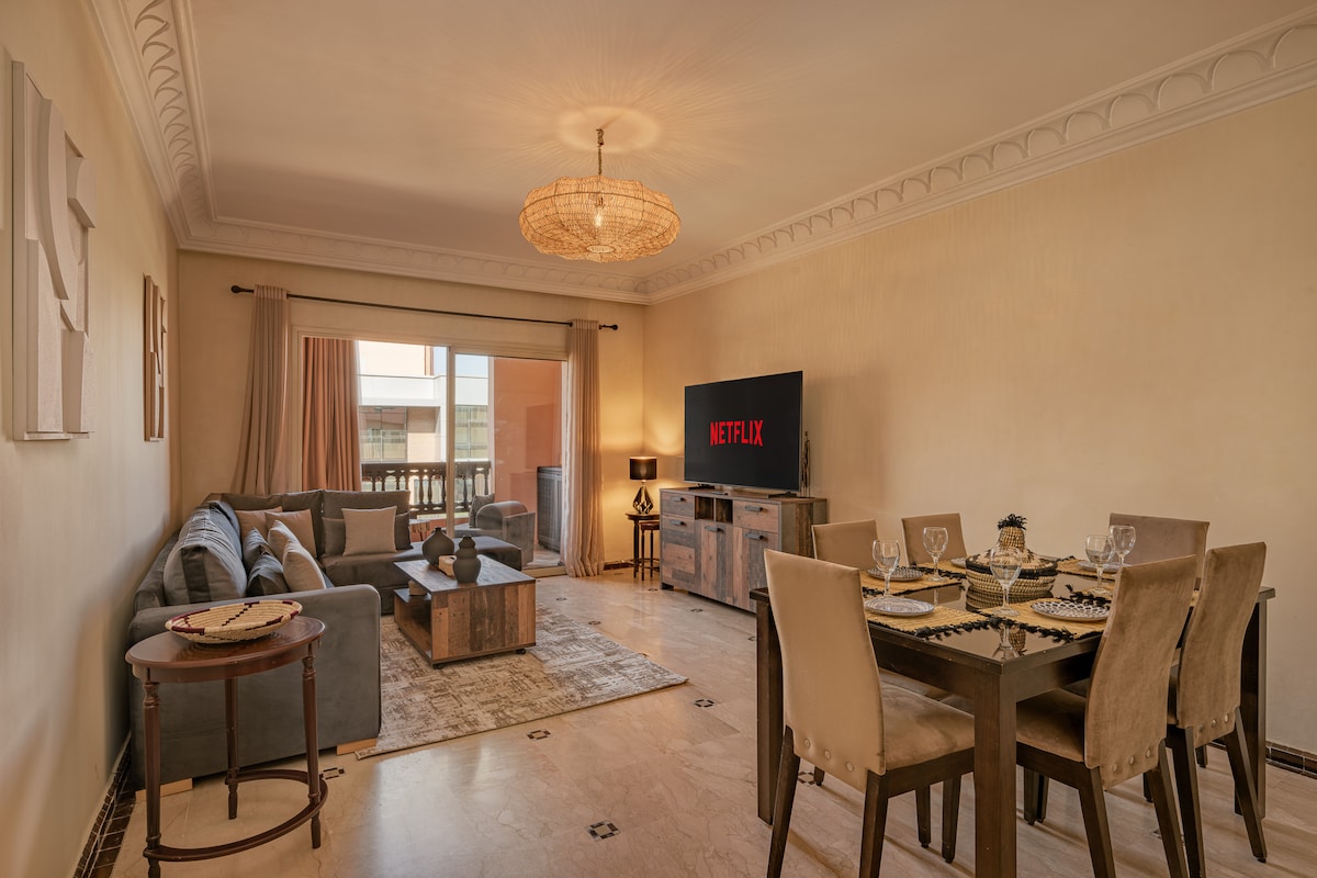 Enjoy a comfortable stay in this modern 2-bedroom apartment in Guéliz, Marrakech, offering style, space, and a prime central location. Close to M Avenue, the train station, supermarkets, restaurants, and major attractions, this apartment is ideal for families, friends, or business travelers looking for convenience and comfort in a secure and quiet residence.