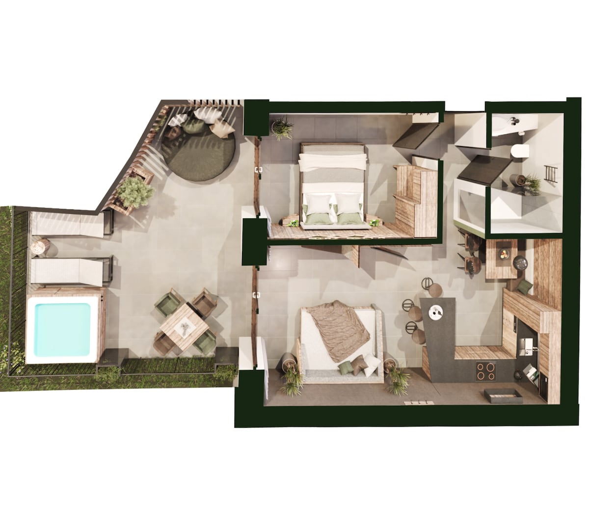 Die moderne Wohnung liegt im ersten Stock und bietet mit ihren zwei Schlafzimmern mit Klimaanlage sowie Schlafsofa im Wohnzimmer, ausreichend Platz für bis zu 6 Gäste. Für die Zeit mit Familie und Freunden zum feiern und entspannen, verfügt unsere Unterkunft zudem über einen großen privaten Garten. Dort befinden sich unter anderem ein Whirlpool, Sauna, Grill, Bar und eine Feuerstelle im Freien, welche kostenlos genutzt werden können. Parkplätze sind vorhanden und stehen kostenlos zur Verfügung.