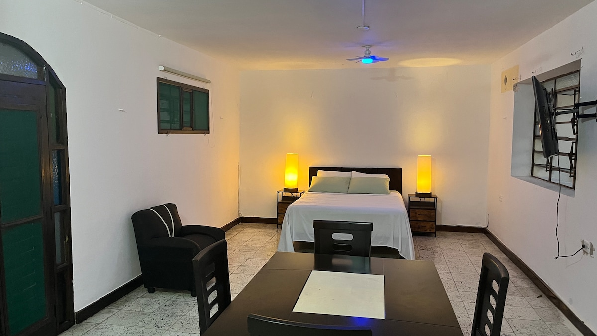 Cómoda y bonita habitación con magnifica ubicación. espacio tranquilo y seguro. Confortable cama, aire acondicionado, ventilador, hamaca mesa de trabajo ,closet plancha, secadora de pelo, wifi, cocineta : frigo bar, horno de microondas, sarten eléctrica, cafetera. Terraza independiente. Magnifica ubicación, a dos cuadras de plaza comercial , Fácil acceso a transporte publico. A siete minutos de avenida PASEO DE MONTEJO, a 10 del centro histórico. Tienda de conveniencia 24 horas.