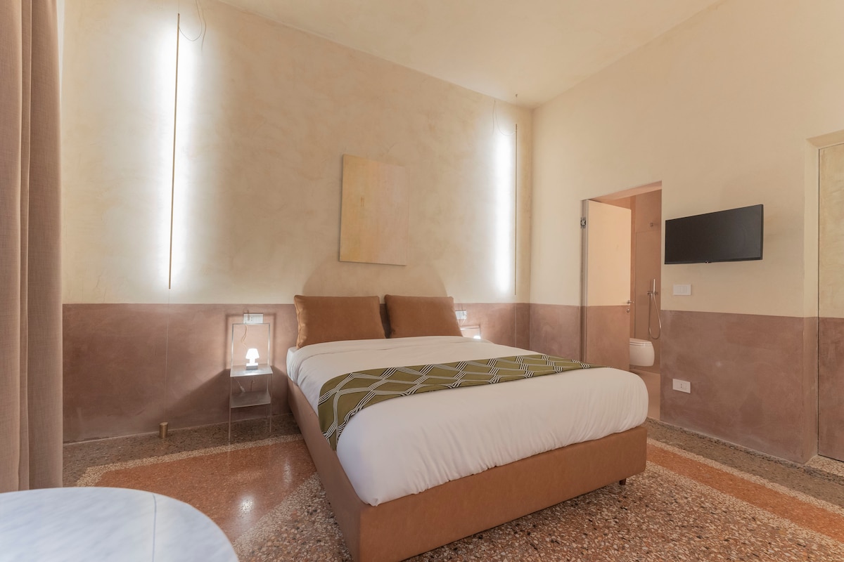 El Studio 306 del Palazzo Archimede ofrece una terraza privada en el centro histórico: un espacio al aire libre poco común en Bolonia, perfecto para una escapada al aire libre después de la ciudad. El interior incluye una cocina de pícnic (tetera, mininevera, cafetera) ideal para preparar comidas rápidas, una mesa de comedor y una cama doble, distribuidas de forma inteligente para maximizar la comodidad y la funcionalidad.