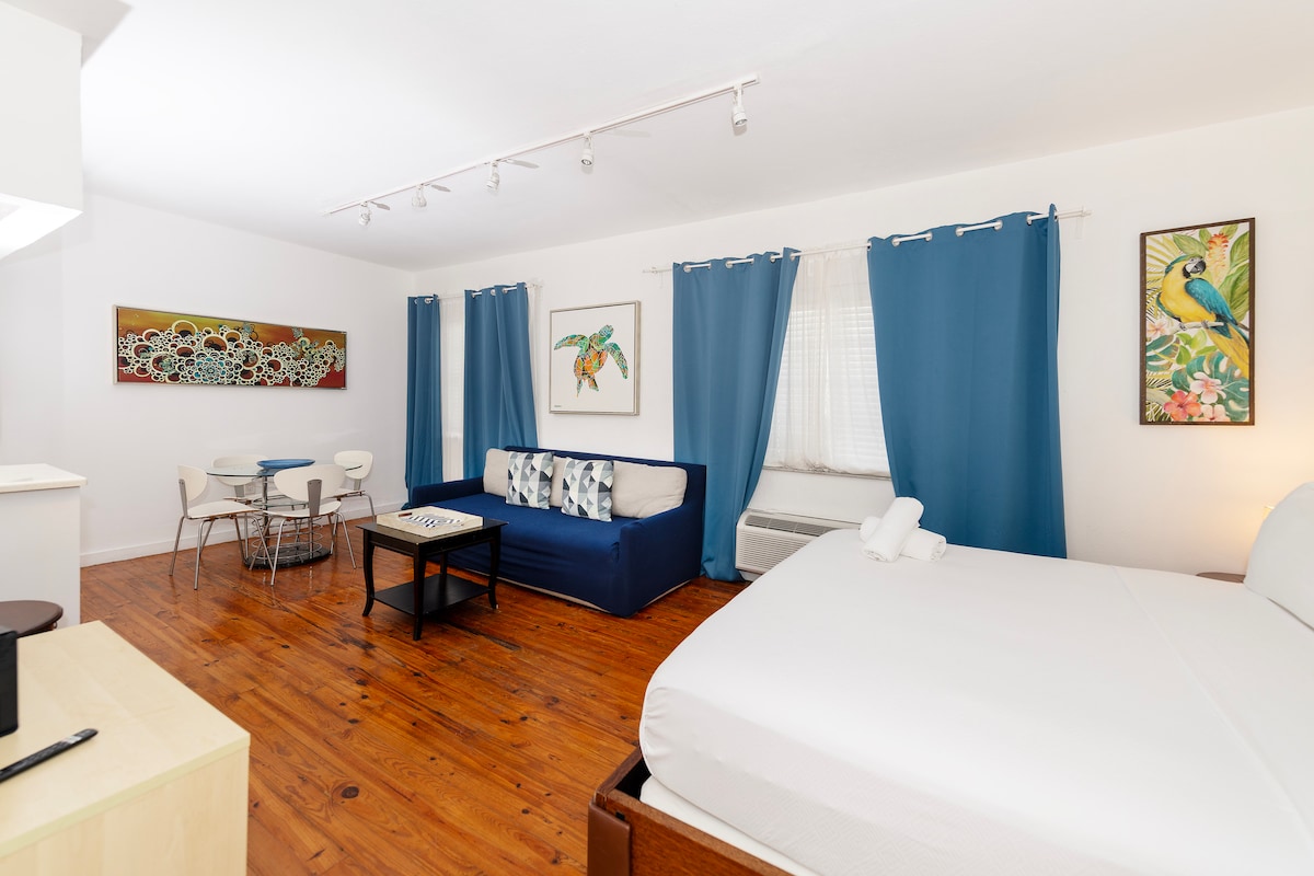 ¡Pequeño estudio perfecto en un hermoso edificio histórico art déco de 1940 ubicado en la maravillosa área de North Beach de Miami Beach! Es un hermoso lugar para disfrutar de tu tiempo en la playa, pero por favor mira la imagen del apartamento y la zona para saber qué esperar. Este apartamento está justo enfrente de la playa y el objetivo principal es disfrutar de la vista y la playa. ¡El apartamento tiene todo lo básico y no es un apartamento de lujo!