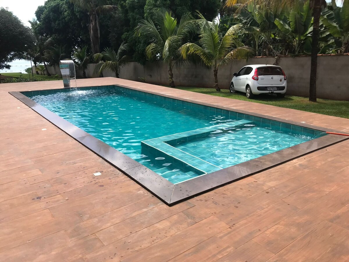 Rancho completo en la comunidad cerrada Píer 2001 en Delta-MG. Piscina con cascada, barbacoa, cocina equipada, 3 dormitorios con aire acondicionado, 3 baños y sala de estar con TV. 12 camas (colchones adicionales bajo petición). Acceso al río por rampa (lancha motora/moto acuática no incluida). Con conserje 24 horas, quioscos, campo, parque infantil, capilla y bar. Ideal para el ocio, el descanso y los deportes acuáticos. Máximo de 15 invitados, no se permite hacer ruido después de las 22:00, fiestas o eventos abiertos, fumar en las habitaciones y mascotas (a petición)