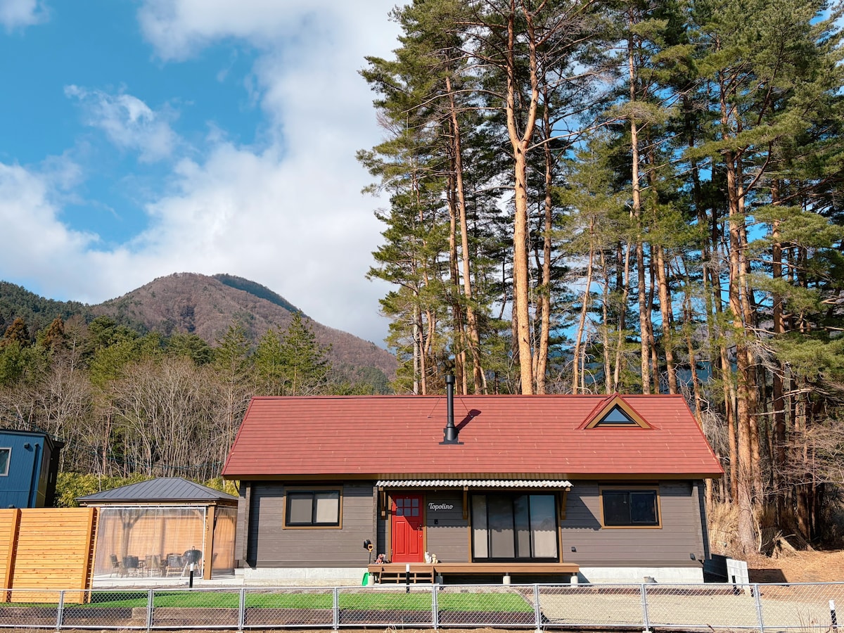 Este alojamiento está limitado a un grupo por día llamado "Private Resort Fuji" en una zona de villas a 11 minutos a pie del lago Yamanaka, renovada por un diseñador en julio de 2024. Es una casa de diseño moderno japonesa basada en un área total de 115 cabañas 3LDK. Cuando subes al segundo piso, puedes ver el gran monte Fuji desde la ventana de la sala de estar, barbacoa en el gran balcón en la parte trasera del monte Fuji, y después de disfrutar de la sauna de barril rodeada de árboles, puedes darte un baño en el bosque en el espacio de descanso exterior.El patio tiene una gran fogata donde incluso puedes hablar alrededor del fuego.Además, hay una valla alta en el jardín, así que si traes a tu perro, no tendrás que preocuparte por huir. La habitación tiene una gran pantalla de 90 pulgadas, donde puedes disfrutar de Prime Video, Youtube y más.Por la noche, también se puede ver el cielo estrellado si las condiciones son las adecuadas.