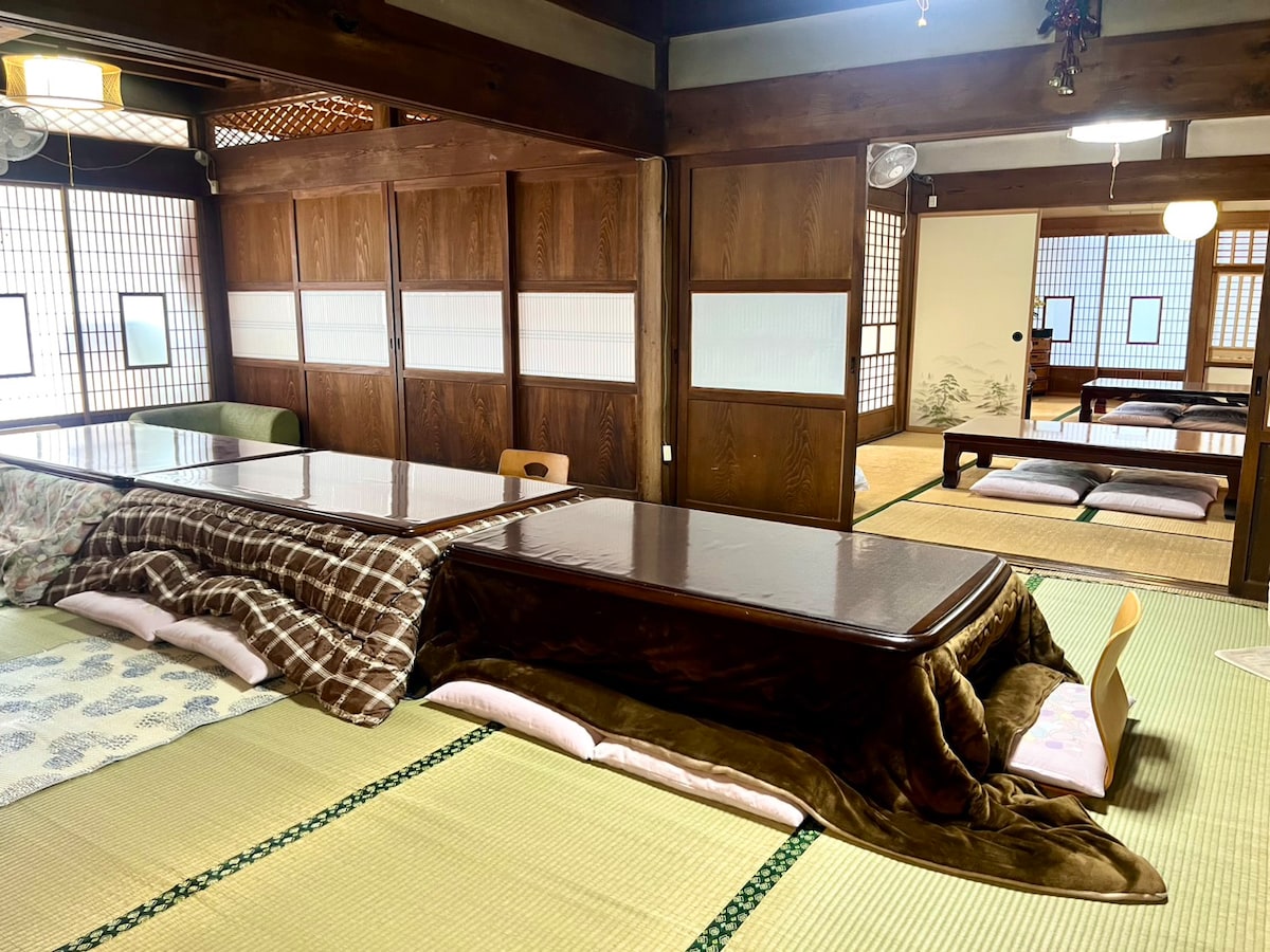 Countryside estate between a vast park and Kyoto-style gardens. This historic silkworm farmhouse was lovingly restored by its owners who created a comfortable space for relaxation & socializing ★ Private 1F, terrace and parking area. No other guests on 2F ★ Dining area and six attached tatami rooms surrounded by a wooden corridor ★ Thick futons ★ Gas BBQ on the terrace, or cook Japanese "nabe" ★ Kitchenware & appliances for heating take out ★ Walk to convenience & grocery stores ★ Nearby onsen