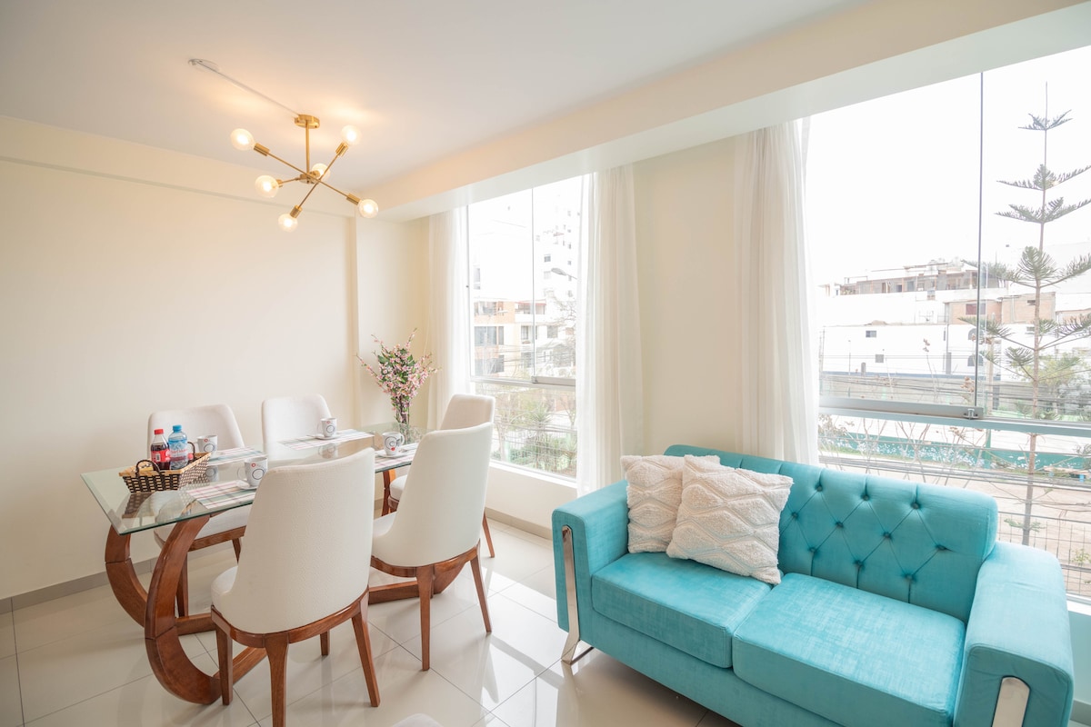 Departamento de estreno, amplio y full equipado, a solo 350 m del malecón de Miraflores. Ideal para descansar, trabajar o disfrutar de una experiencia tipo cine en casa gracias a su proyector HD y ecran automático. Cuenta con 2 dormitorios (principal con cama queen y TV 4K), sala con sofá cama queen y balcón con vista lateral al mar. Wifi 100MB. Contamos con cochera. Excelente ubicación, cerca de Larcomar, cafés, museos y restaurantes top.