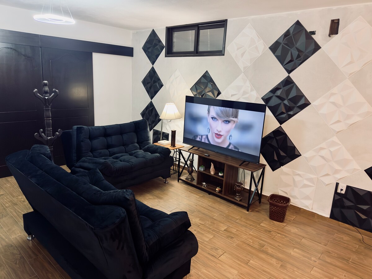 Cómodo mini departamento, con una habitación muy amplia y todo lo necesario para una estancia agradable y placentera, cuenta con una cama matrimonial, un sofá cama, cocina equipada, un baño amplio, aire acondicionado, smart tv con netflix, Internet y una excelente ubicación, muy cercana a las partes más visitadas de nuestra ciudad.