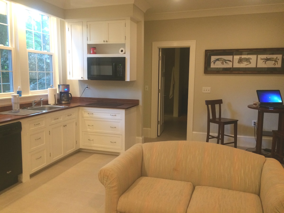 Nuestra casa de huéspedes se encuentra detrás de nuestra casa en una hermosa calle móvil con un dosel de roble vivo y detalles de musgo español. La casa de campo de 600 pies cuadrados ha sido remodelada manteniendo el antiguo estilo sureño y el encanto que hace que Mobile sea una ciudad tan encantadora. Después de despertar de un sueño reparador en la cama tamaño king, disfrute de su café/té de la mañana en el patio privado al aire libre. Entra y sal cuando quieras a través de una puerta privada que da al patio.