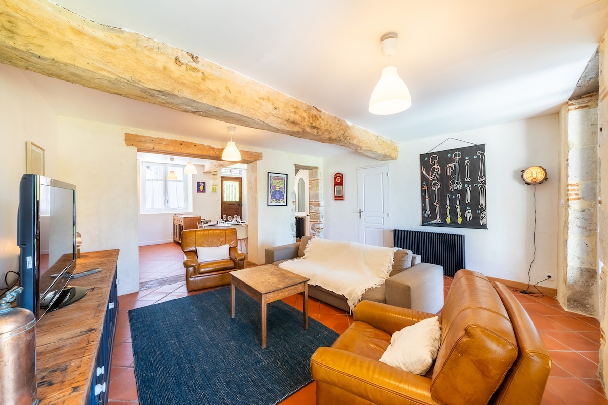 🌸🌞 Antigua granja de piedra de Lot y Garona totalmente renovada cerca de Agen, idealmente situada entre Toulouse y Burdeos. En un espíritu de campo chic, dispone de la totalidad del alojamiento, su patio interior y su jardín vallado con piscina atípica segura, campo de petanca y sus zonas de juegos para niños (trampolín, columpio...). Capacidad de 9 a 13 personas. 🌸🌞