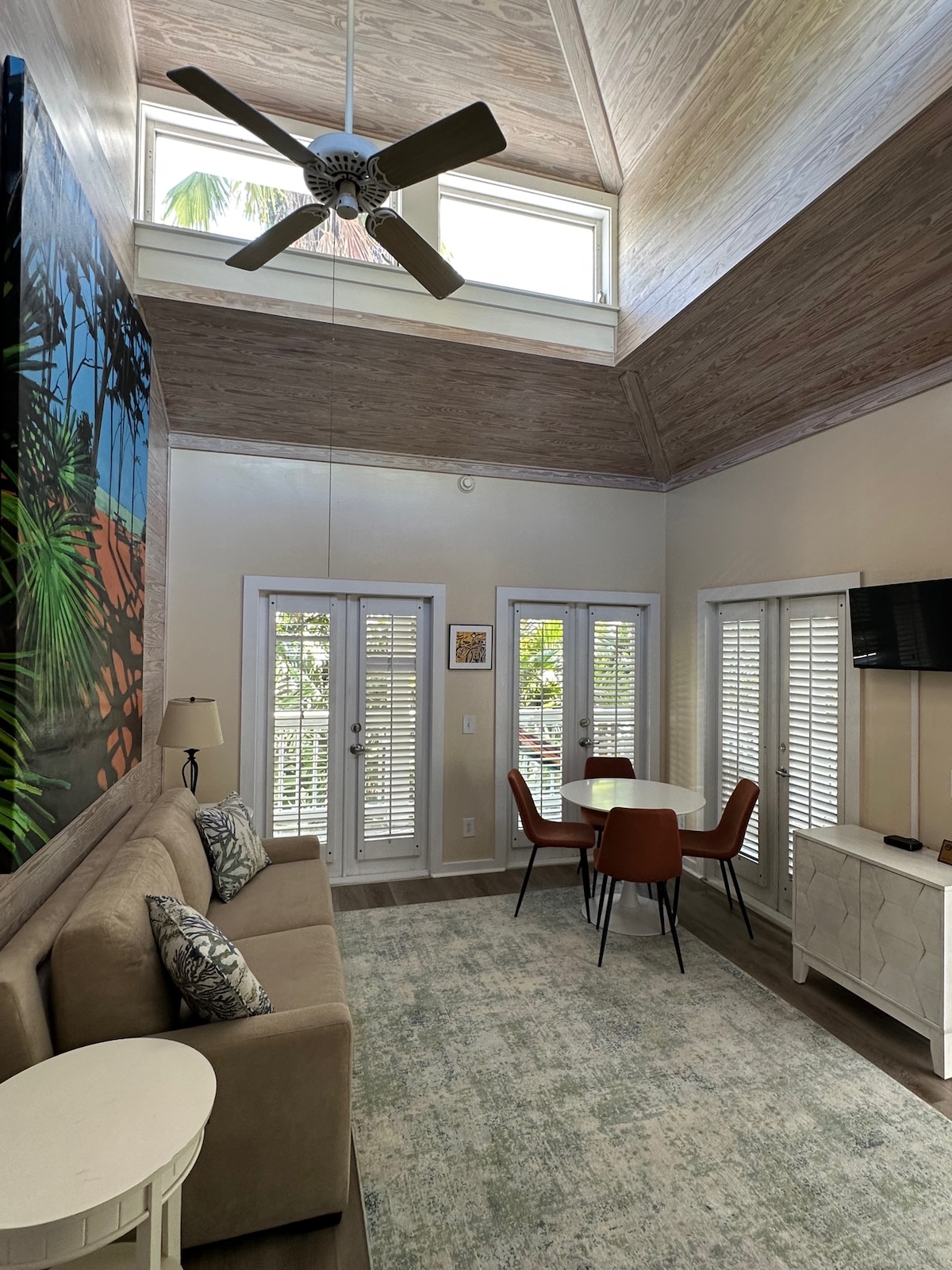 The Parrot 's Perch (anteriormente Zeke' s Retreat) es una suite llena de sol con techos altos que cuenta con una sala de estar con un sofá cama tamaño queen, un porche envolvente con una hamaca, una pequeña cocina con un horno de convección \microondas y un dormitorio con una cama tamaño king con un balcón privado con vistas a las palmeras. Capacidad para 4 personas. Desayuno de cortesía incluido. Disfruta de 3 piscinas, wifi y televisores inteligentes. Estacionamiento de pago muy limitado disponible en el lugar por orden de llegada.