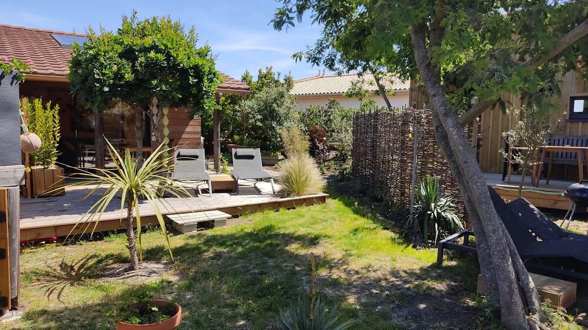 Casa de madera con espíritu cabaña en una gran parcela de 500m2 vallada, gran jardín sin vecinos, centro completo. Terraza grande con sombrilla grande. A dos pasos del mercado más grande de la región, y a 5 minutos de la playa central. Estarás cerca de todos los servicios a pie: la calle principal y sus tiendas, el supermercado, el mercado, bares, restaurantes, playas… deja el coche . El alquiler de ropa de cama (sábanas, toallas...) es posible y se paga en el lugar (20€ por persona).