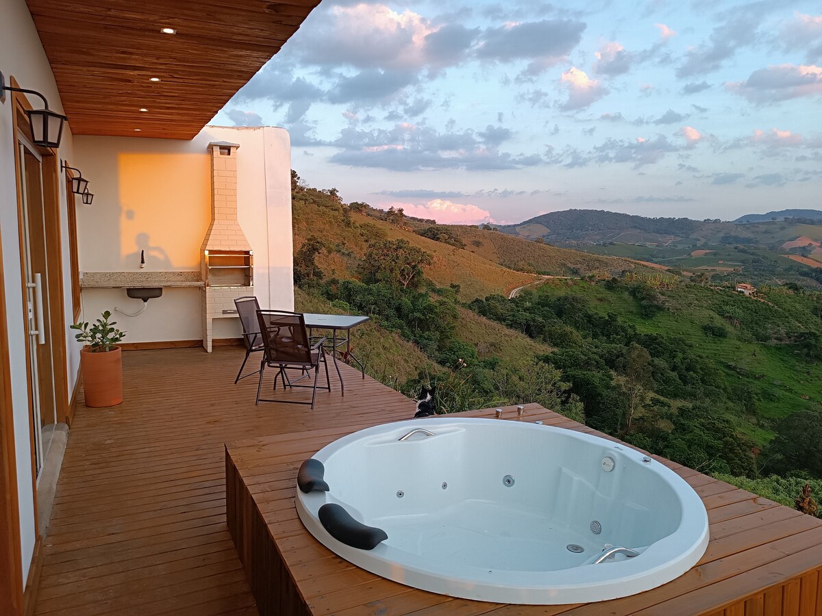 Escapada romántica en medio de la naturaleza, ideal para parejas. Chalet de estilo suizo (de estilo A) en un rancho rodeado de plantaciones de café, con un río privado y una cascada. Cuenta con bañeras al aire libre con vista a la Serra da Mantiqueira, un jacuzzi interior, una chimenea, una parrilla, una cancha de beach tennis, una cama columpio, una sauna seca con vista y un proyector interior con una pantalla de 100 pulgadas.