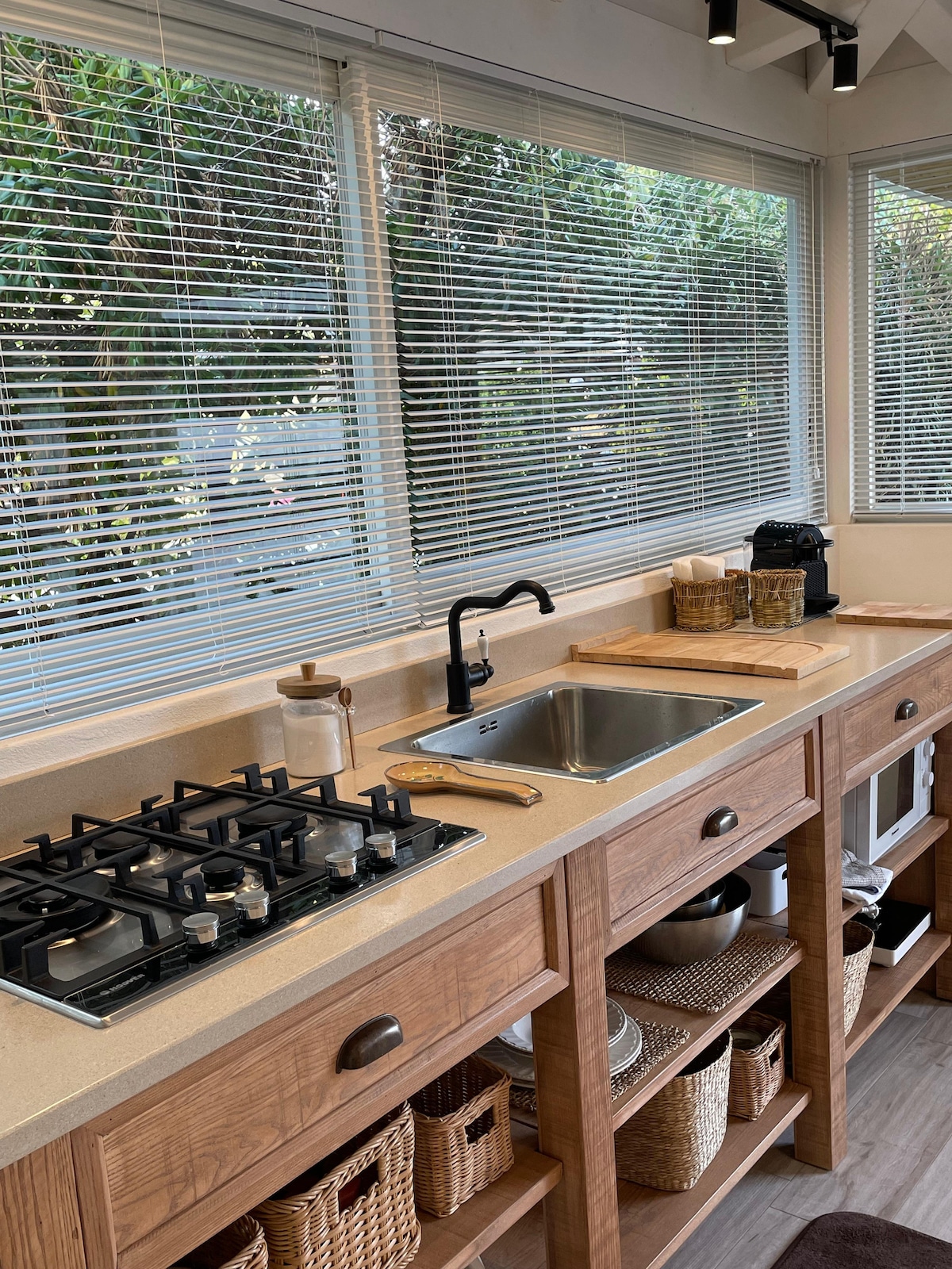 La casa tiene vistas a un amplio espacio abierto con una pequeña cocina al aire libre y un jardín con diferentes tipos de plantas mediterráneas y árboles que rodean la villa. En la planta baja hay una gran cocina y sala de estar con chimenea y sofá cama; arriba hay un dormitorio doble y uno con 2 camas individuales, una antecámara, un balcón, el baño. Todas las habitaciones tienen calefacción, ventanas (con red) y armario. Hay aire acondicionado en la planta baja y en el primer piso.