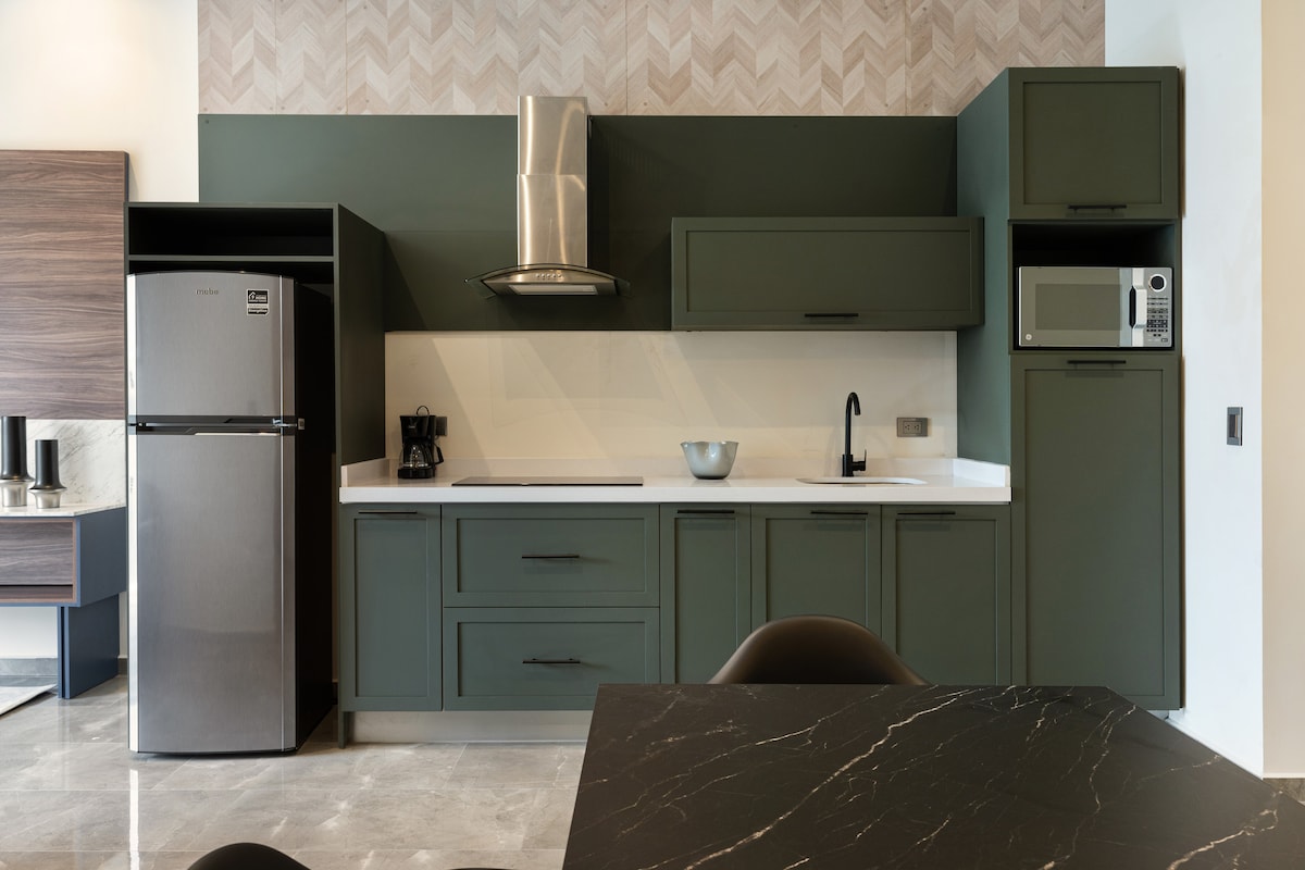 Moderno departamento nuevo en plena Colonia Centro, ideal para disfrutar la ciudad y moverte fácilmente a cualquier zona. Cuenta con alberca en área común (cerrada los lunes) y cajón de estacionamiento techado. Totalmente equipado para tu estancia: cocina con refrigerador, microondas, cafetera, vajilla y sartenes, además de TV y wifi. 1 recámara con cama matrimonial, 1 recámara con cama individual y 1 sofá cama. Ideal para viajes de trabajo o turismo.