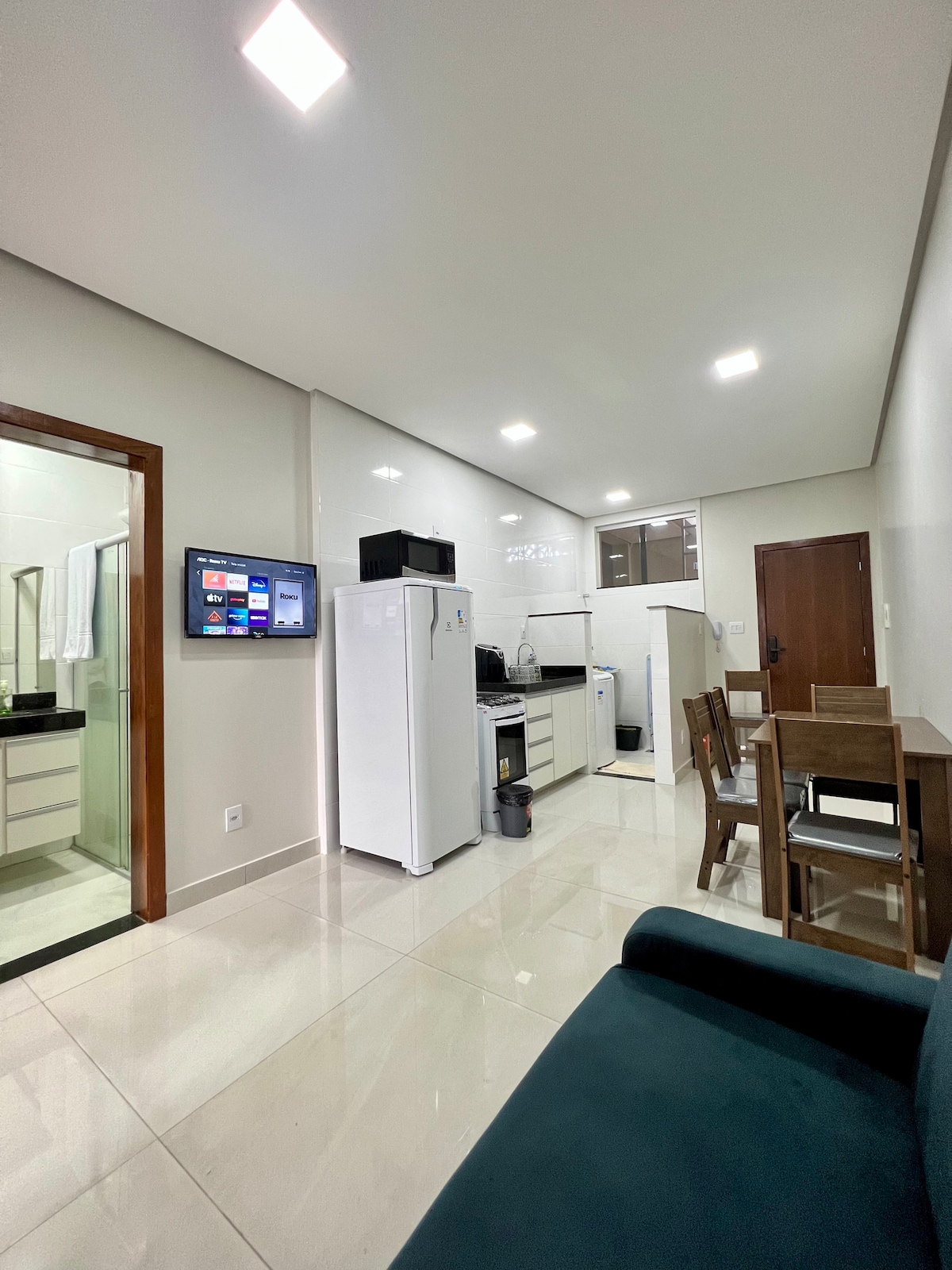 Bem-vindos ao nosso charmoso e moderno Studio, perfeito para viajantes que buscam praticidade e estilo. Ideal para casais ou executivos, este espaço foi cuidadosamente projetado para oferecer o máximo de conforto em um ambiente compacto. Relaxe após um dia de trabalho ou passeio em uma cama confortável, aproveite o Wi-Fi de alta velocidade e utilize a cozinha compacta para preparar suas refeições. Localizado em uma área tranquila, oferece fácil acesso aos principais pontos da cidade.