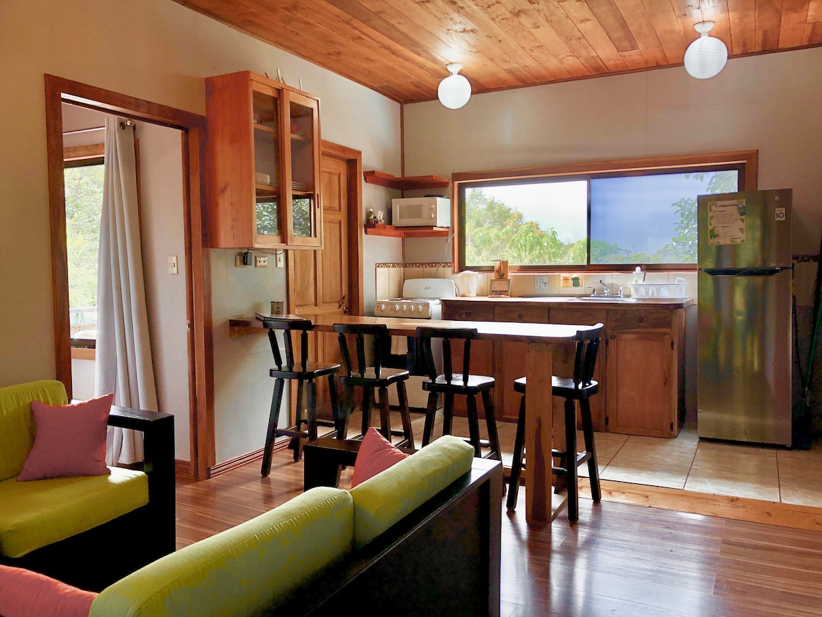 El estudio es un acogedor espacio en la planta superior ( 1 cama tamaño king) con vistas panorámicas del bosque. La nueva característica con balcón a nivel de la cubierta ofrece una vista panorámica desde su lugar privado, perfecta para contemplar el bosque local. La ubicación está rodeada de árboles tropicales y con vistas a pastos verdes. También refrigerador, un quemador, nevera pequeña y cafetera. Cocina limitada.