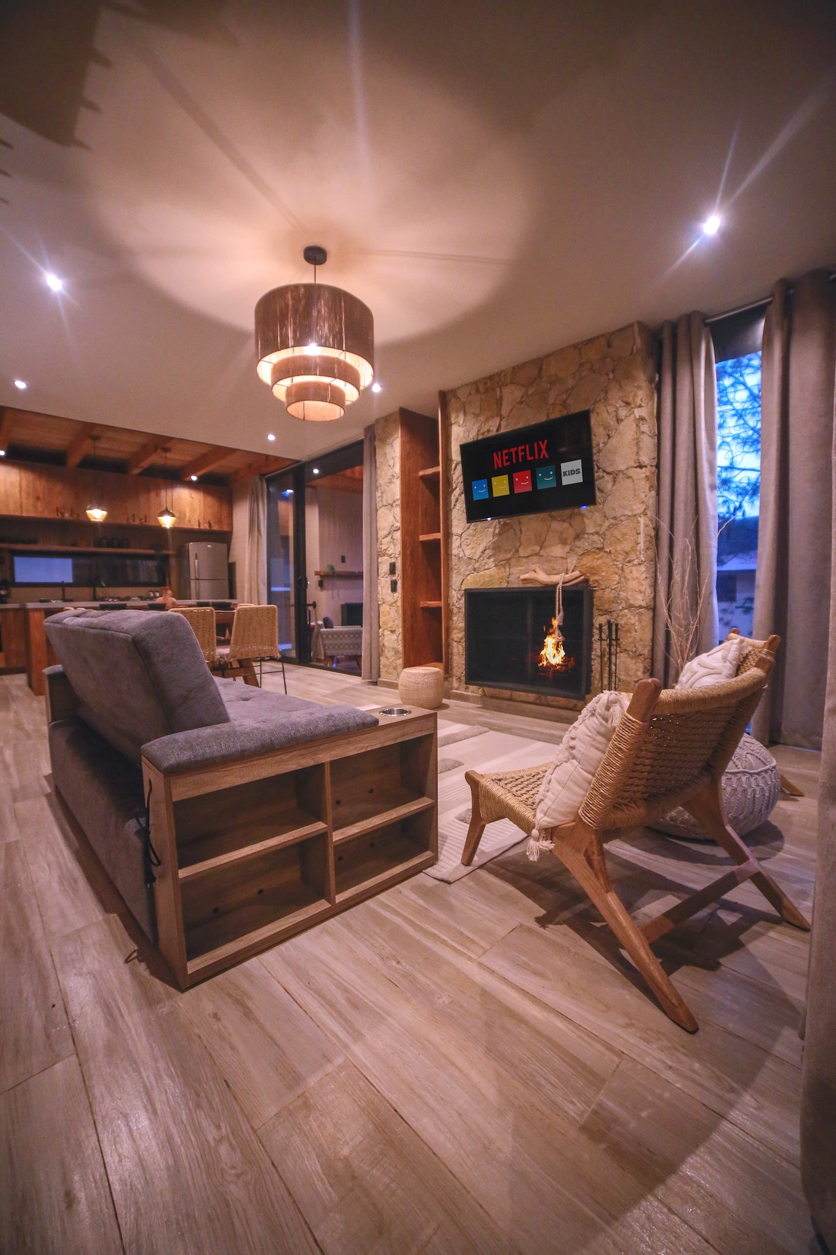 Cabaña en Paseo de los Cazos, perfecta para disfrutar en familia o con amigos. Ubicada a solo 5 minutos del centro, 15 minutos de la cascada y 3 minutos de la renta de caballos y motos RZR. De estilo mediterráneo y diseño sustentable, construida con materiales naturales que crean un ambiente cálido, relajado y en armonía con la naturaleza. Cada espacio está pensado para convivir, descansar y crear momentos inolvidables rodeados de tranquilidad.