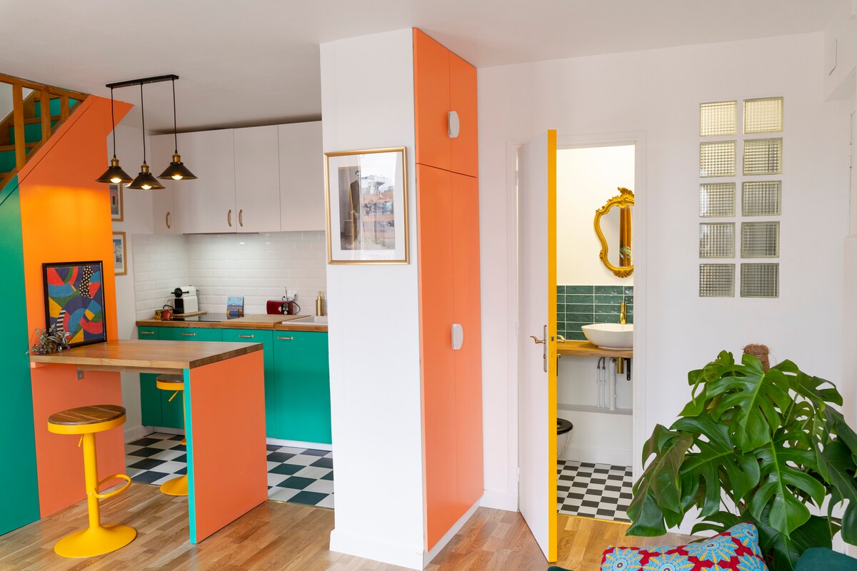 Pequeño dúplex original situado en el corazón del centro de la ciudad de Montreuil y a 5 minutos de París. El estudio consta de una sala de estar amplia y acogedora. Un baño. La zona de cocina está equipada con nevera, horno combinado con microondas y lavadora. Se accede a la entreplanta por una escalera de escalones japoneses. El espacio del dormitorio se encuentra en el altillo-balcón con vistas a la sala de estar.
