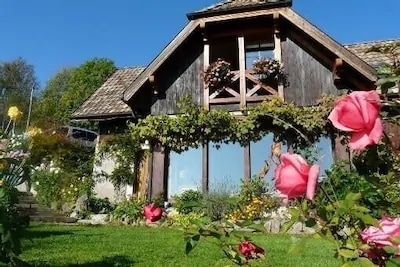 Desde Geishouse, pueblo de montaña del Parque Regional Ballon des Vosges a 750 m, podrá visitar Alsacia , hacer senderismo o simplemente relajarse en el lugar. Esta cabaña, semienterrada y con todas las comodidades, ofrece unas vistas impresionantes del pueblo y del paisaje natural. Se abre por completo a su terraza privada en el hermoso jardín de flores. Durante todo el año podrá disfrutar de los numerosos espacios del jardín y, en verano, de la sombra de los grandes árboles junto al estanque natural.