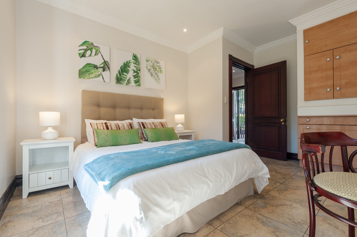 Energía de respaldo SOLAR completa y AGUA de respaldo. Esta casa de campo, situada en una zona segura y en expansión en Gallo Manor, ofrece un descanso tranquilo del bullicio de Sandton. La casa de campo colinda con la vivienda principal, con entrada independiente. Acceso a través de la puerta principal de la vivienda. A poca distancia a pie de tiendas, restaurantes y la estación de autobuses Gautrain. Fácil acceso a las autopistas N1 y M1 y a los parques de oficinas cercanos. Dormitorio con vistas al jardín. El espacio recientemente renovado incluye wifi, Netflix, té/café; estacionamiento seguro fuera de la calle.