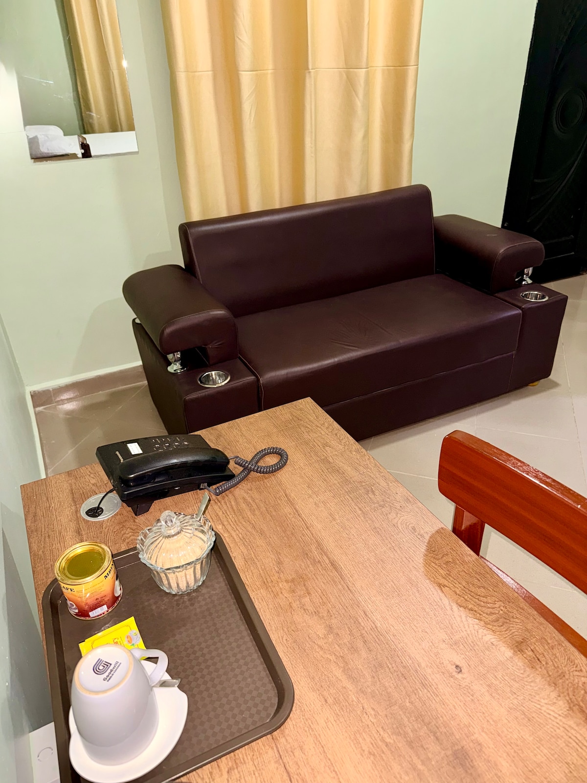 Spacious deluxe AC room with private bathroom, two person sofa seating area, TV with DSTV/Netflix access, work desk, and Wi-Fi. Enjoy extra comfort and complimentary breakfast at Prime Rest House in Dodoma.