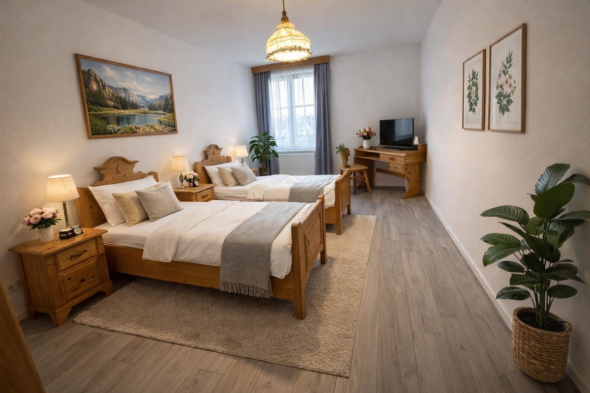 Dieses gemütliche Doppelzimmer verbindet klassischen Alt-Wiener Stil mit hellen, freundlichen Farben. Das Zimmer bietet ein komfortables Bett, viel Tageslicht, einen Schreibtisch sowie ein gepflegtes Badezimmer. Ideal für Paare oder Einzelgäste, die eine ruhige, charmante Unterkunft mit traditionellem Wiener Flair suchen.