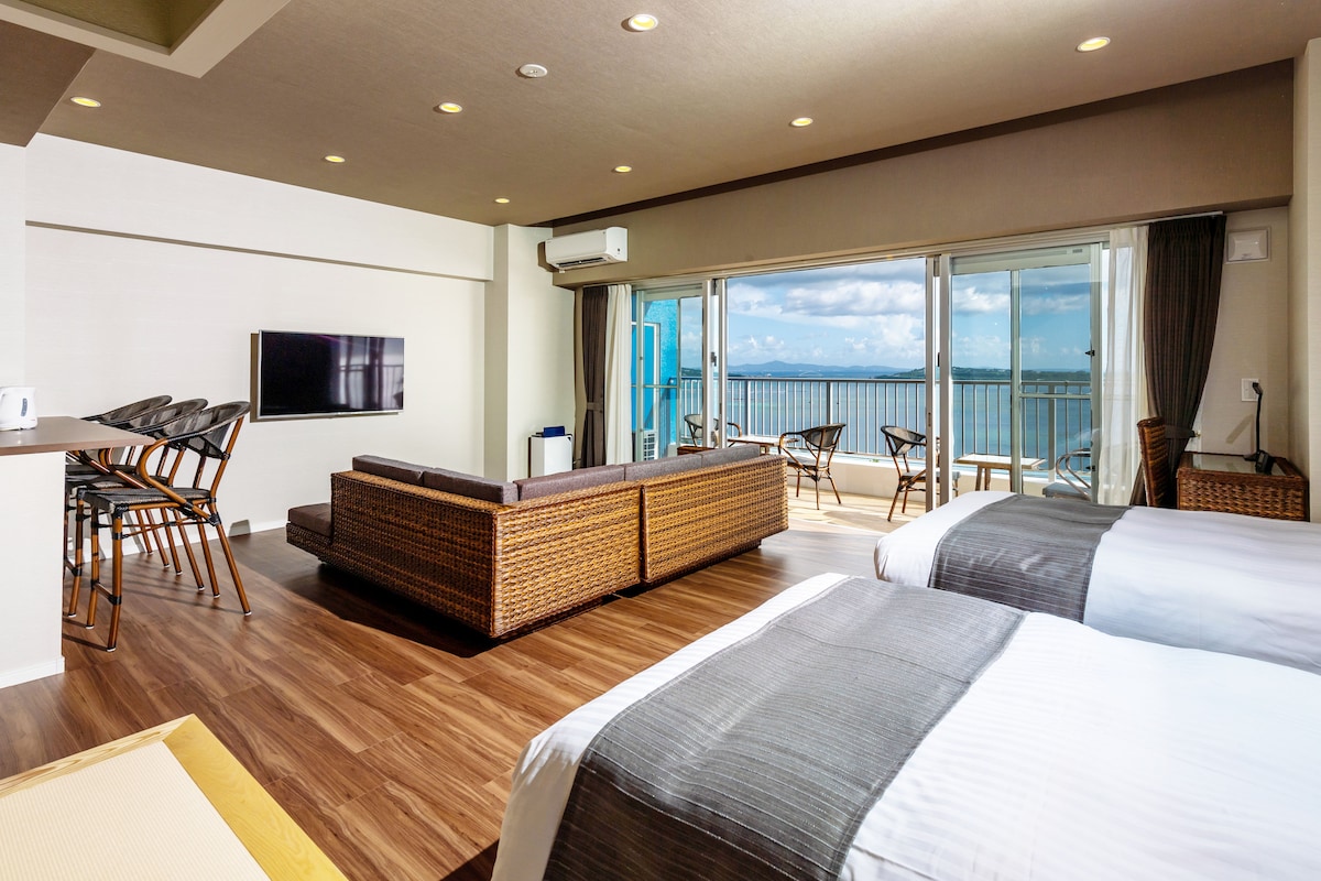 A 1 minuto a pie del mar, con una vista espectacular, algo raro en Okinawa, con una playa privada de lujo y habitaciones suite en el tercer piso.