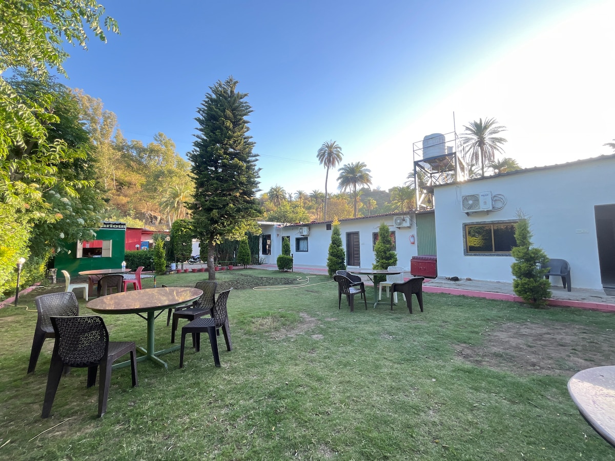 Habitación familiar de lujo rodeada de exuberantes palmeras verdes y dátiles con vistas a las lejanas montañas marrones de Arbuda. La deliciosa guarida de Babbars es como un soplo de aire fresco lejos del polvo y el calor y las enloquecidas multitudes de Delhi. Es tranquilidad, serenidad y relajantes alrededores. Te refrescan al entrar en él.
