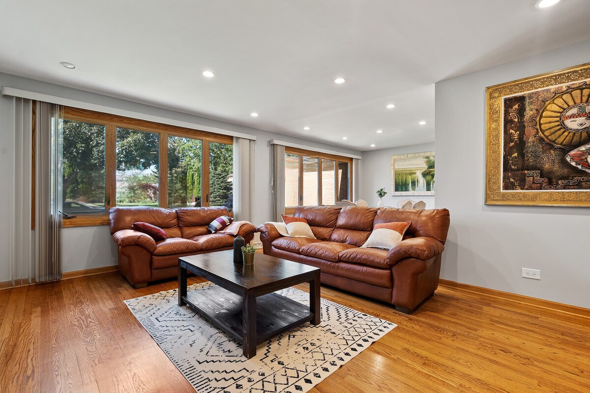 Rancho unifamiliar en un barrio tranquilo. Capacidad para 8 personas. 4 dormitorios con camas tamaño queen. 2 baños completos. Cocina bien equipada. Sofás de cuero, TV de 60 pulgadas, juegos de mesa en la sala de estar. La zona recreativa ofrece mesa de futbolín, TV de 60 pulgadas y un cómodo sofá modular. Internet. Garaje. Patio trasero privado vallado, patio y parrilla Weber. A 15 minutos del aeropuerto O'Hare, Allstate Arena, centro de convenciones y Fashion Outlet en Rosemont y Rivers Casino. Fácil acceso a I94 e I294.