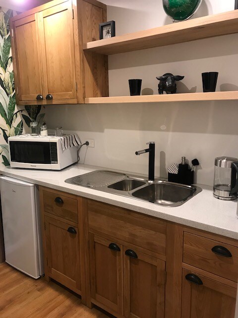La suite de invitados es luminosa, soleada y excelente para una estancia corta. Con persianas opacas para la privacidad, la oscuridad y el control de la temperatura. Una puerta corredera separa el baño del dormitorio y proporcionamos un calentador o ventilador portátil dependiendo de la temporada. El espacio incluye nevera, tostadora, hervidor de agua, té de hierbas Twinings, café instantáneo y vajilla básica. Tenga en cuenta que NO hay instalaciones para cocinar (no hay horno ni microondas) debido al pequeño tamaño de la habitación. Taburete y mesa para desayunar/tomar el té.