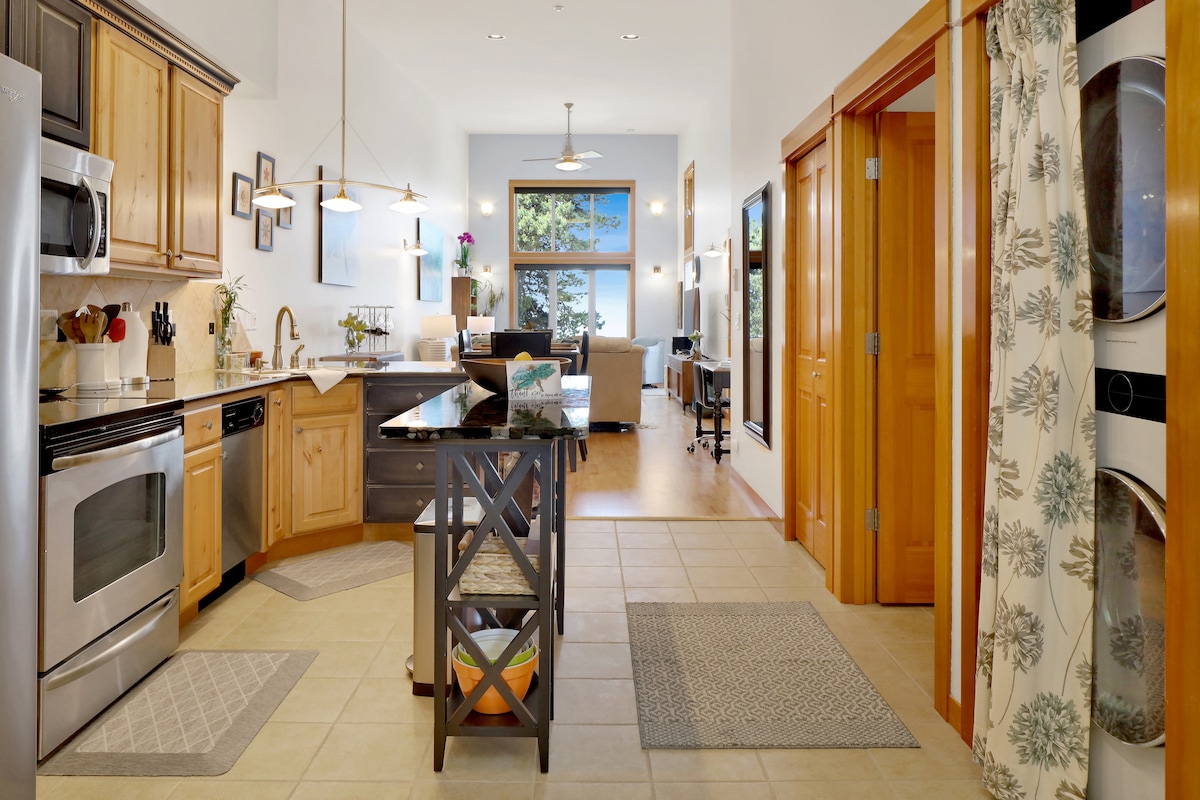 Explora, relájate y experimenta el encantador pueblo costero de Langley en la isla de Whidbey. Nuestro moderno apartamento en el centro de Langley cuenta con una mezcla de muebles modernos de mediados de siglo de alta calidad con obras de arte contemporáneo. La habitación principal y la de invitados reflejan camas de la más alta calidad y ropa de cama de lujo. En la sala de estar, acércate a la chimenea o cocina una comida gourmet en nuestra cocina de alta gama totalmente equipada. Junto a la sala de estar hay un balcón privado con vistas a un tranquilo espacio verde.