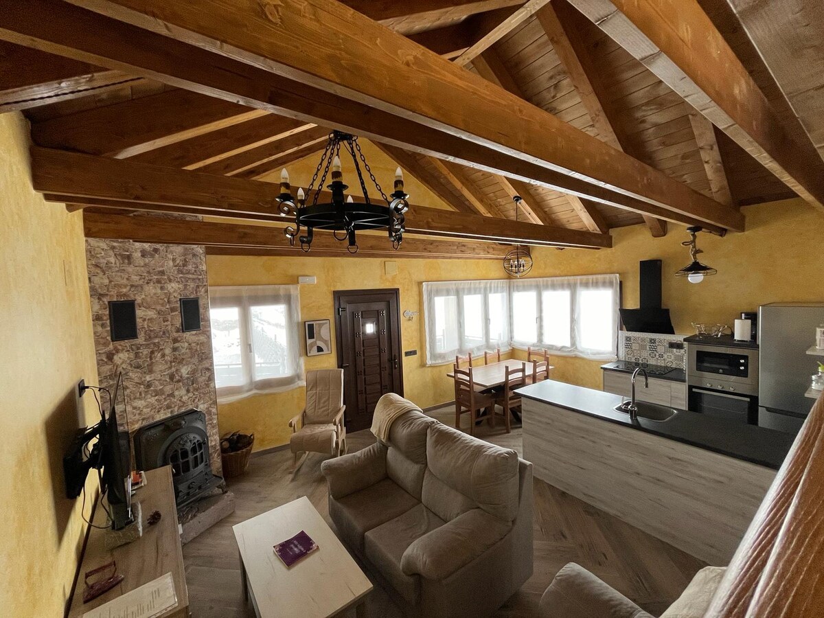 Nuestro LOFT de MONTAÑA está especialmente diseñado para parejas o parejas con niños. Destaca por sus grandes y confortables espacios, todos ellos con fantásticas vistas a las montañas. -Salón chimenea con vistas panorámicas. -Cocina muy bien equipada. -Cama abatible de matrimonio y sofá cama. -Baño completo en piedra Natural. -Porche panorámico climatizado. -Cocina de Verano con Barbacoa y Horno de Leña. -Piscina de piedra natural con una zona de Solárium. -Fuentes, Jardines y amplias terrazas.