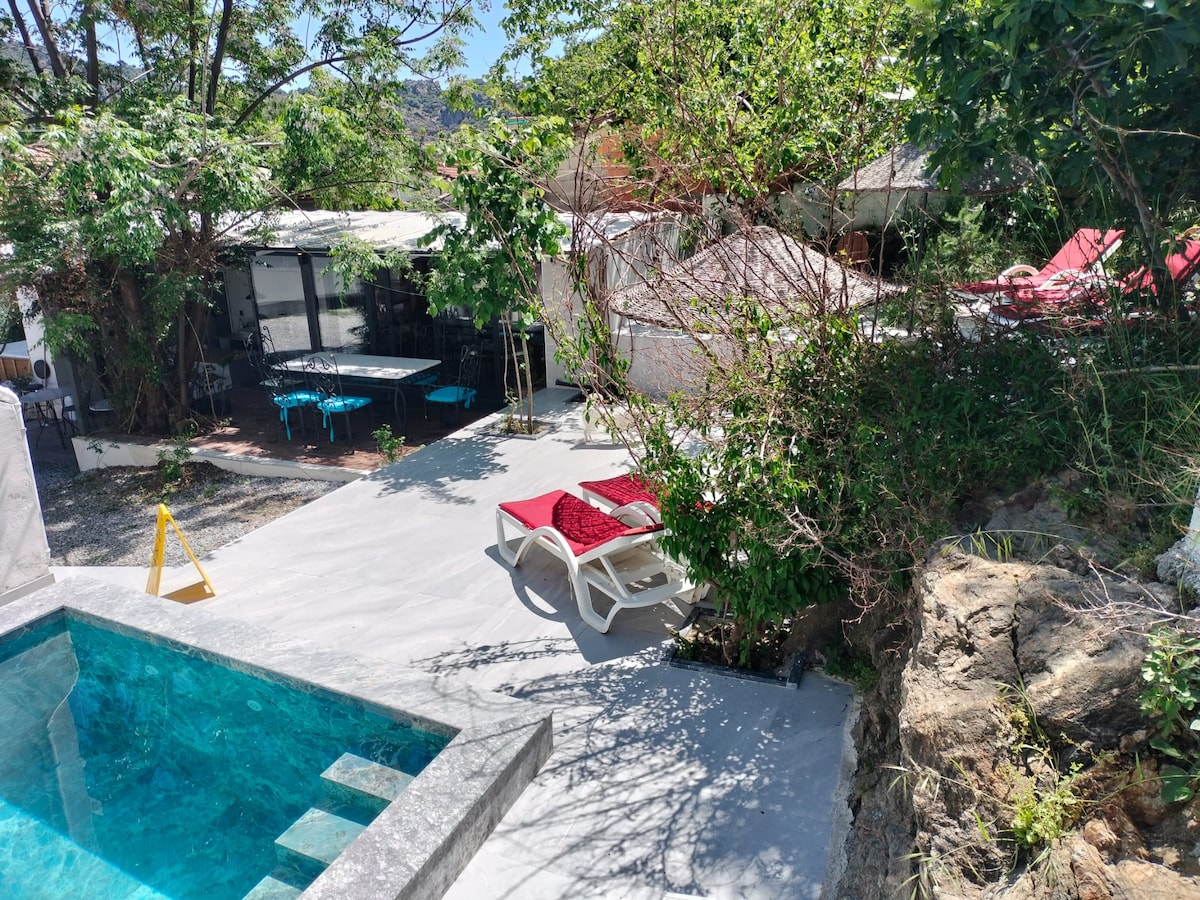 Mavi Bungalow, que se inspira en la naturaleza en Kayaköy, Fethiye, puede satisfacer todo lo que espera de una casa con sus cómodos muebles, piscina protegida, arquitectura especial y su ubicación cerca de todas las zonas de vacaciones en Fethiye.