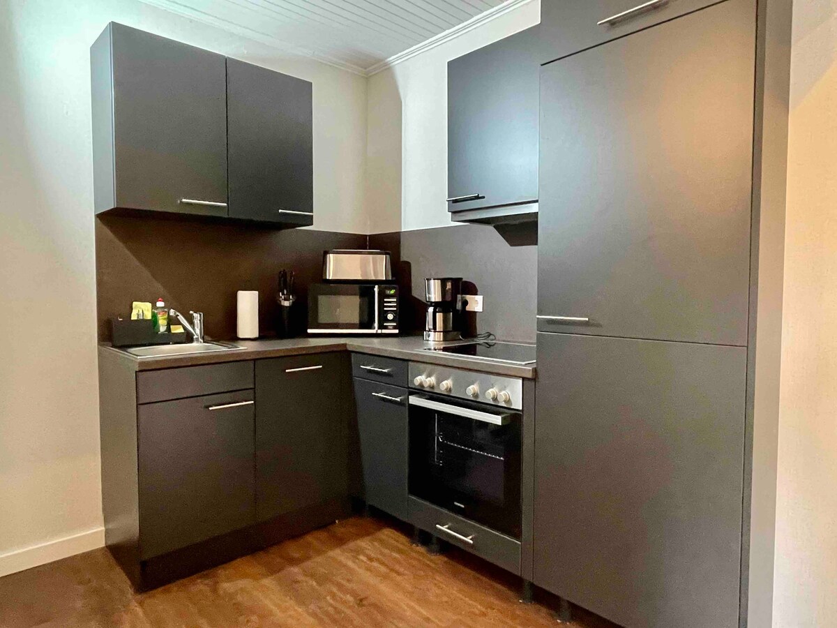 Experimenta un estilo incomparable en 90 metros cuadrados en la suite Mokka Neumünster, a pocos minutos del centro outlet de diseño, la estación de tren y el Holstenhallen. Dos dormitorios con camas de somier garantizan noches relajantes, el baño con ducha emana encanto moderno con acentos negros. Una cocina totalmente equipada y un televisor inteligente garantizan una estancia cómoda. Estacionamiento privado disponible. Ubicación (en minutos) Designer Outlet Center: 5 Estación de tren: 3 Holstenhallen: 7 Hamburgo y Kiel: 35