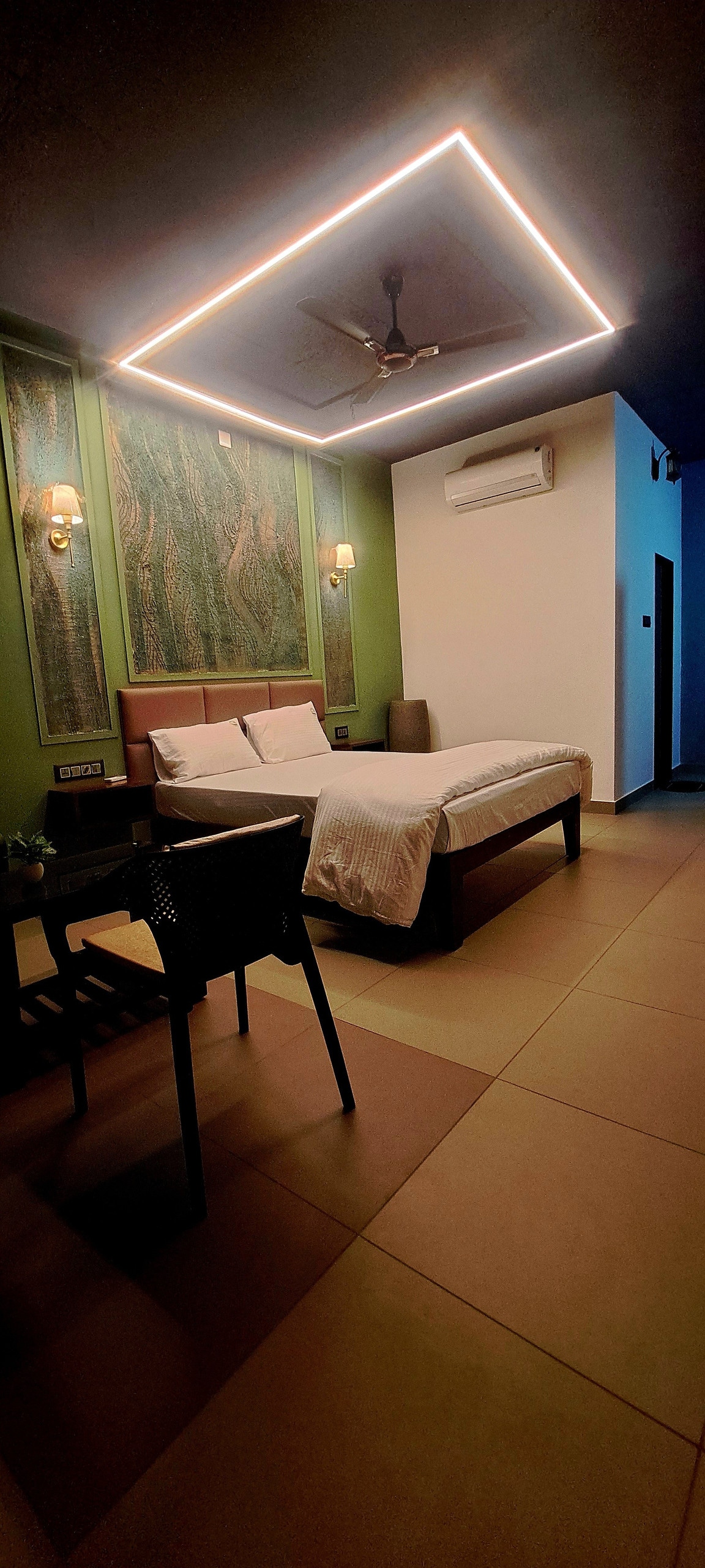 La habitación de playa de Dakshinamurthi Beach Stay es un refugio ideal para aquellos que buscan unas vacaciones serenas y relajantes junto al mar. La habitación es espaciosa y está bien amueblada, con camas cómodas, sábanas limpias y comodidades modernas para garantizar una estancia cómoda y agradable. La decoración está hecha con buen gusto con colores relajantes y obras de arte de temática de playa que crean un ambiente tranquilo y pacífico. La habitación también cuenta con un balcón privado que ofrece impresionantes vistas al océano y al paisaje circundante.