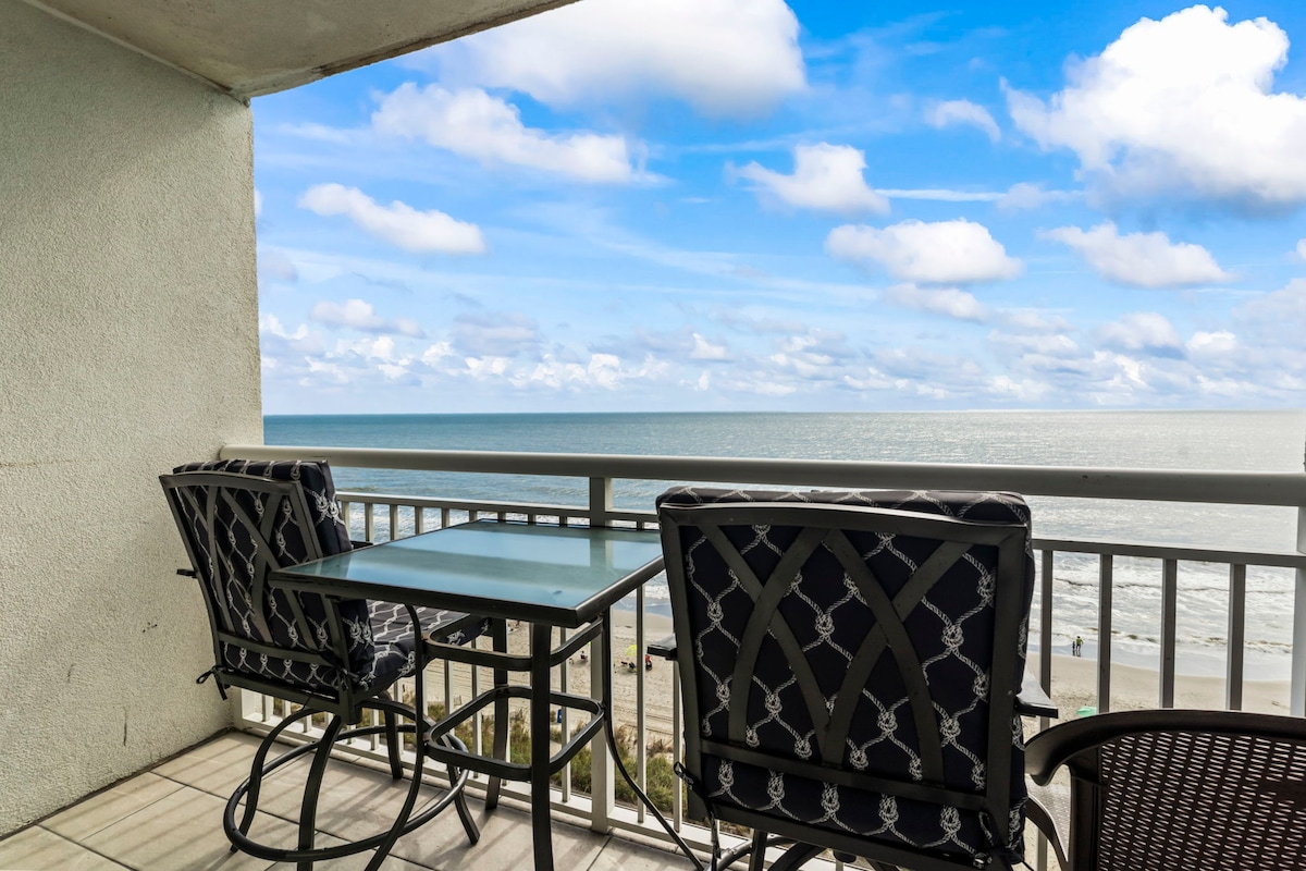 Disfruta de vistas al mar desde un balcón privado. - Cafeteras Keurig K-pod y de filtro. - Cómodo dormitorio: dos acogedoras camas tamaño queen. - Sofá cama: en la sala de estar. -Cocina totalmente equipada. - Smart TV de 55 pulgadas en el salón y el dormitorio. Servicios del centro vacacional: - Piscinas interiores y exteriores. - Jacuzzis - Río lento. - Gimnasio. - Wifi gratuito: mantente conectado. - Acceso directo a la playa - Aparcamiento adjunto disponible. - Ubicación céntrica: - Cerca del paseo marítimo de Myrtle Beach, el SkyWheel y las atracciones locales.
