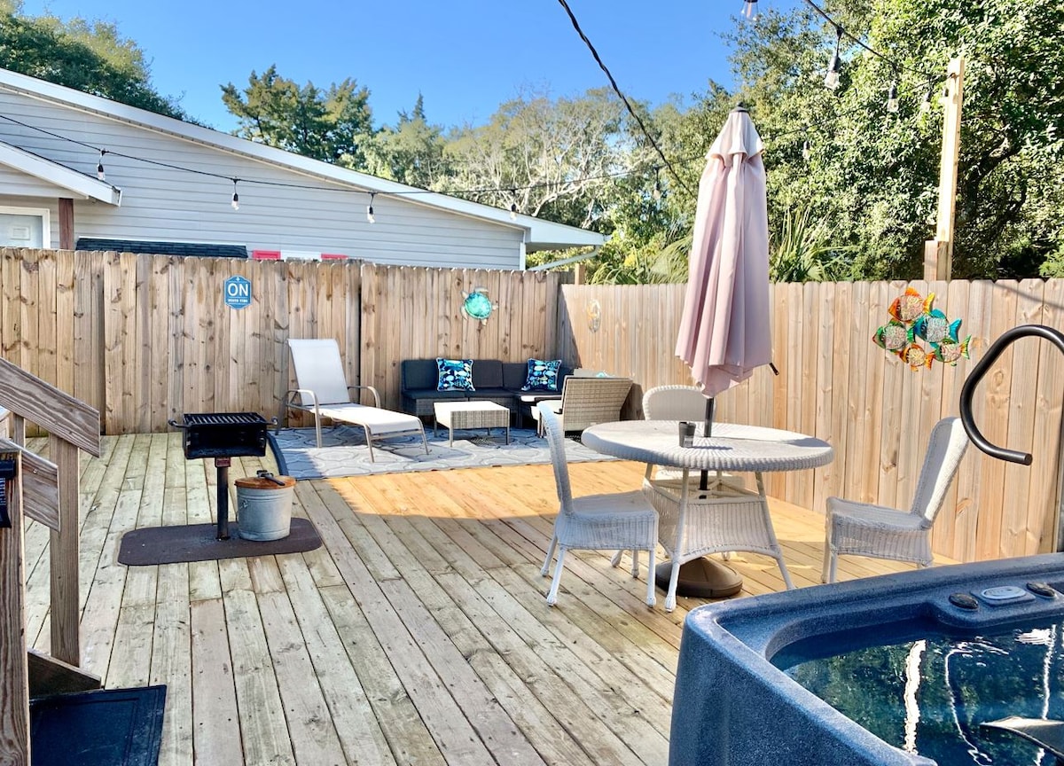 ¡Tu familia estará cerca de todo cuando te hospedes en esta hermosa casa de playa con ubicación céntrica que está a solo 3 minutos a pie (1000 pies) de la playa y del mundialmente famoso paseo marítimo de Myrtle Beach! Completa con tu propio jacuzzi privado, una gran terraza y patio privados impresionantes, un hermoso patio privado vallado, mucho aparcamiento y mucho más. ¡Esta acogedora casa incluye una cama tamaño king y mucho espacio para estirarse o descansar al sol! ¡Completa con un recorrido virtual 360 que se envía al reservar!