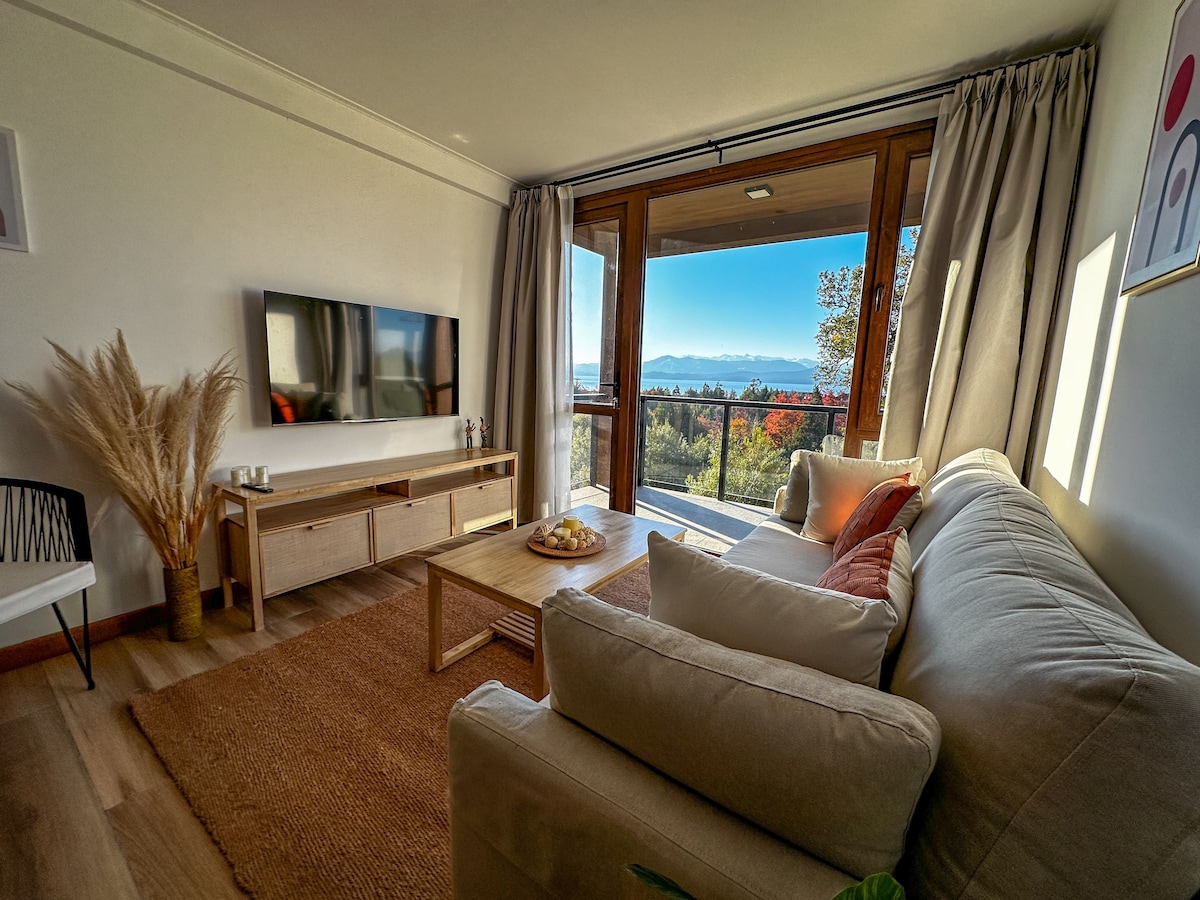 Es un apartamento con una vista increíble al Lago Nahuel Huapi y las montañas que puedes disfrutarla tanto desde la sala, como del balcón relajado saboreando un chocolate o tu bebida favorita. Es el lugar ideal para una hermosas vacaciones !! Te esperamos!!!