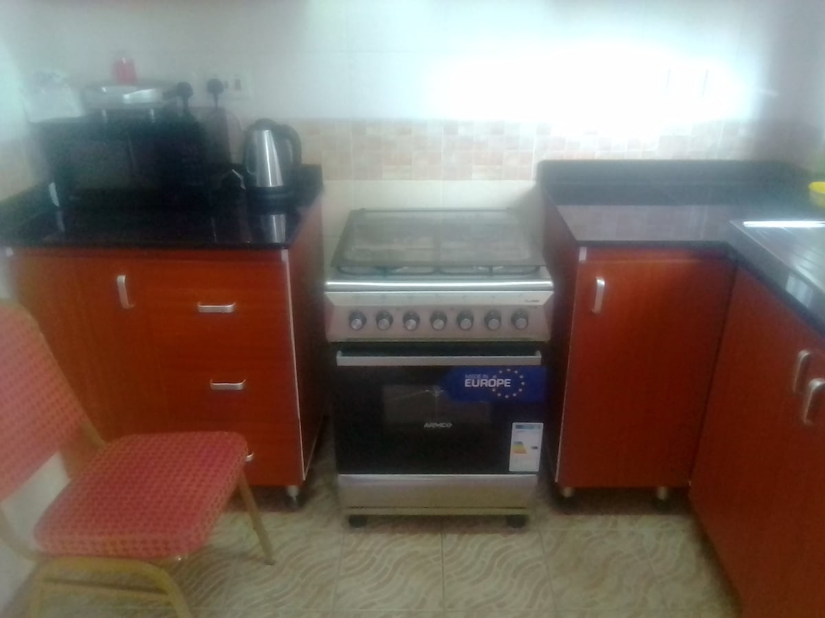 This space is a wonderful place, its a neatly ebony lit one(1) bedroom, suitable for a couple. Comes with own privacy, shower/toilet, small kitchen with stove and modern kitchen appliances. Main access through stairs entry, property fenced with massive parking. Outside is a huge shared balcony area, sitted on the rooftop of the building at the 7th floor. Bedroom fitted with wardrobes, a queen size bed, hot shower, very beautiful 1 bedroom in general.