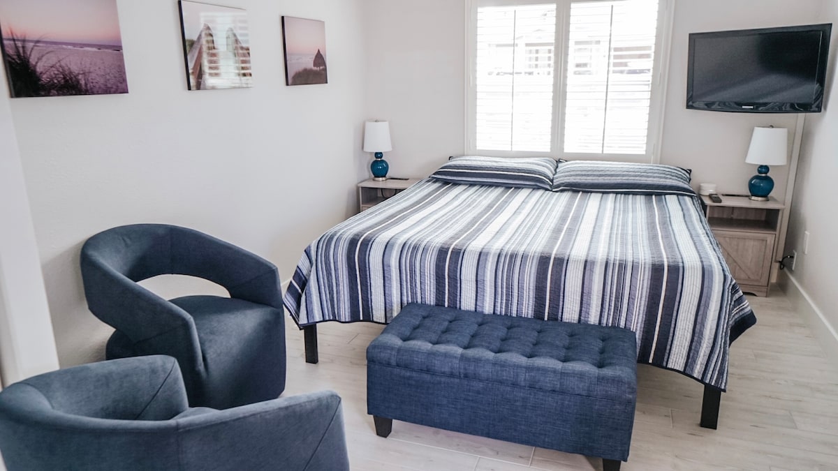 ¡Playa a pocos pasos de este condominio bellamente remodelado! Alquiler de restaurantes y motos acuáticas de DOC, justo al otro lado de la calle. Equipo de playa disponible junto con un carrito para transportar. Lujosa cama tamaño king con colchón extra de felpa. Sofá cama tamaño queen. Nuestro estudio tendrá capacidad para 3 personas (2 adultos, 1 niño). Piscinas recientemente renovadas abiertas el 2 de abril de 2025.