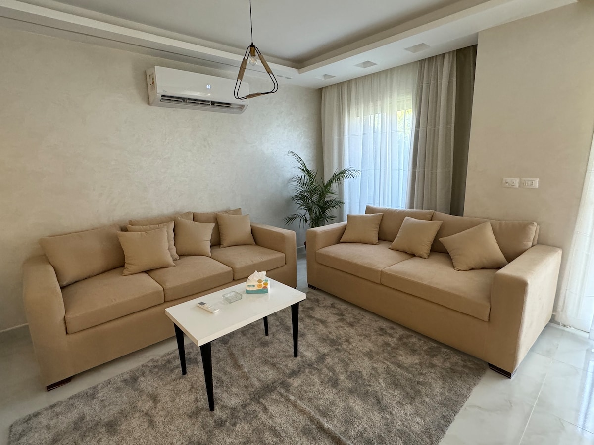 ¡Bienvenido a mi encantador apartamento de lujo! Mi apartamento está ubicado en un complejo seguro de lujo con un amplio jardín muy bonito y una zona infantil. Disfruta de la elegancia moderna de 2 dormitorios, aire acondicionado completo y comodidad. Elegante sala de estar, cocina totalmente equipada. Te encantará la decoración elegante y el ambiente acogedor, lo que lo convierte en el hogar perfecto lejos de casa. * Internet de alta velocidad. * A 10 minutos del centro de la ciudad y del centro comercial Almaza. * A 15 minutos del centro comercial Cairo Festival. * A 15 minutos del aeropuerto. ¡Reserva ahora para disfrutar de una estancia excepcional!