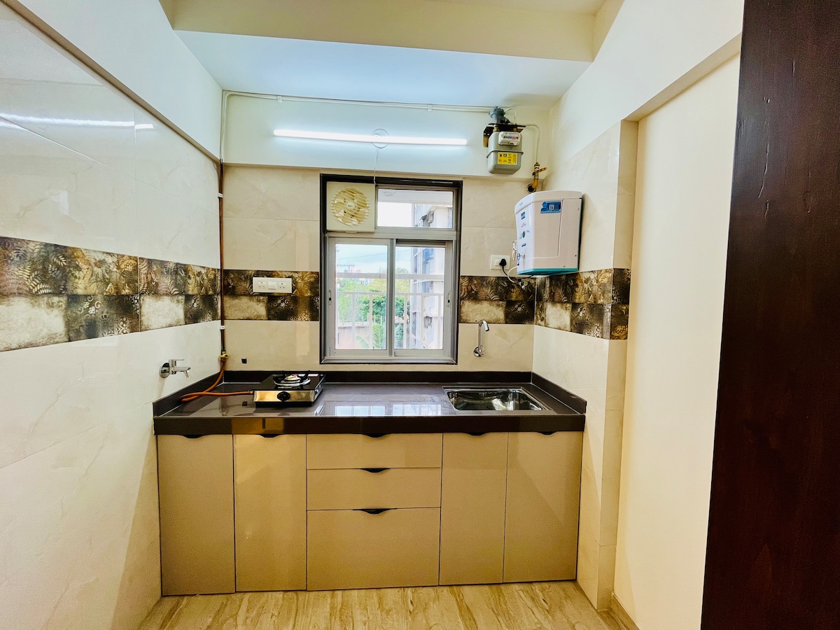 Madhuleela by Innjoyful | 20 mins to NMIA (Airport) 600 sq ft., big size 1-bed accommodation. Here, we have 4 apartments in the same building. Your comfort zone with a fully equipped kitchen with a washing machine, microwave oven, and a gas connection. Enjoy exclusive privacy in this 1st-floor apartment—the only apt on the entire floor. Sensory Garden: 50m Juinagar Station (W): 350 m Sanpada Station 1.7 km Mindspace Juinagar: 2.6 km Vashi Station: 3 km DY Patil Stadium: 3.9 km